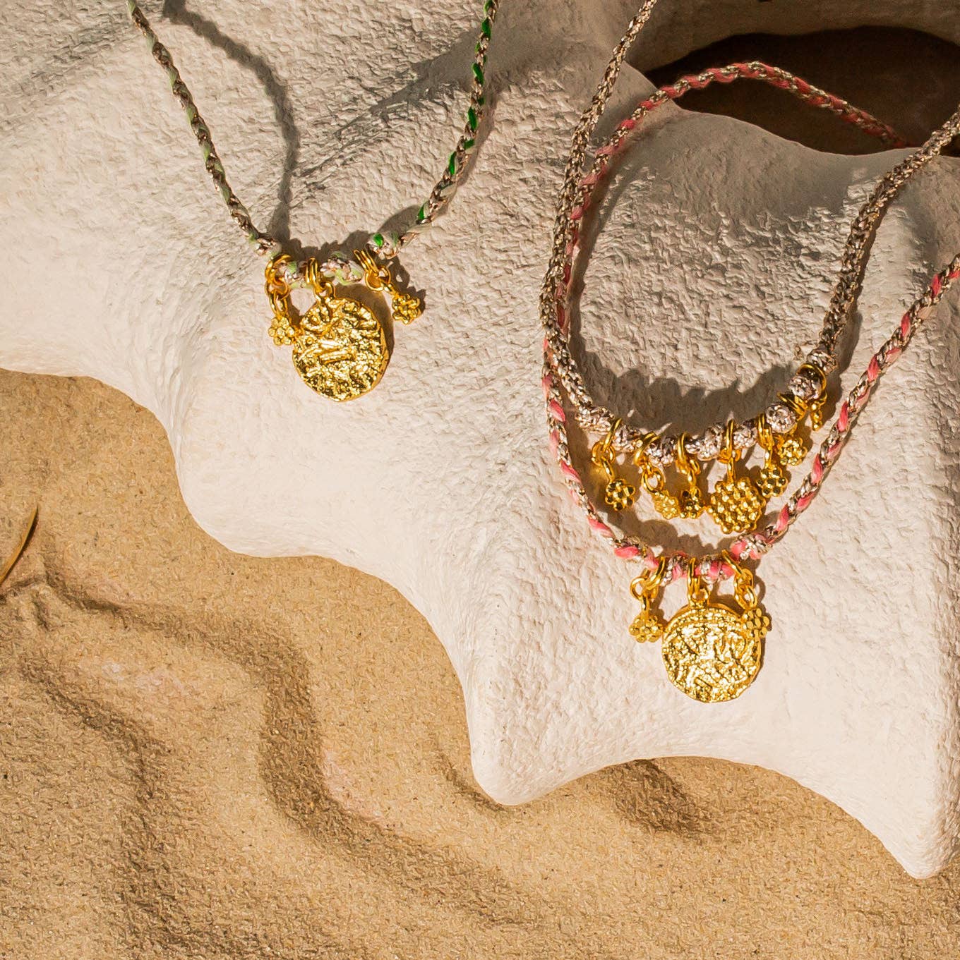 Diese handgeflochtene Kordelkette besteht aus vergoldetem Messing und wurde mit einem charakteristischen Münzanhänger und zwei kleinen blumenförmigen Anhänger geschmückt. Kombinieren Sie dieses lässige Schmuckstück mit anderen Modellen, um den Layering Look zu erzielen.