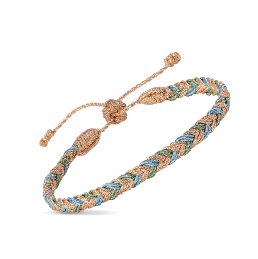 Mit seinem geflochtenen Look und dem eleganten Design kombiniert dieses Armband Eya sanfte Pfirsich- und Pistazientöne und verleiht Ihrer Armbandkollektion einen erfrischenden und subtilen Charme.