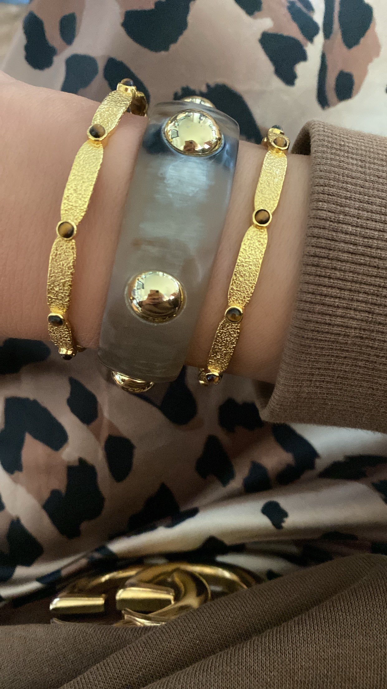 Der einzige Accessoire-Trend, den Sie 2025 kennen müssen, sind Armreifen. Dieses Modell von Argento Furioso ist ein äusserst schicker Begleiter. Er besteht aus vergoldetem Messing mit einer gehämmerten Struktur und ist mit Tigeraugen besetzt. Er passt zu allen Schmuckstücken, die Sie bereits besitzen. Statt unter dem Ärmel werden die Armreifen jetzt über Pullover, Blazer und Co. getragen.