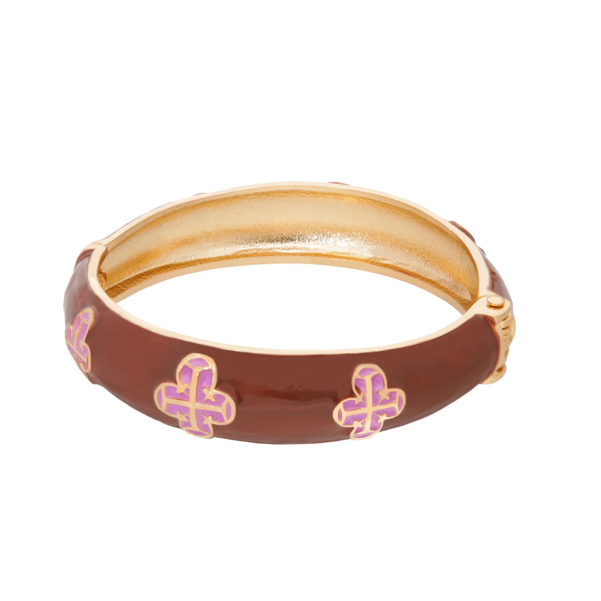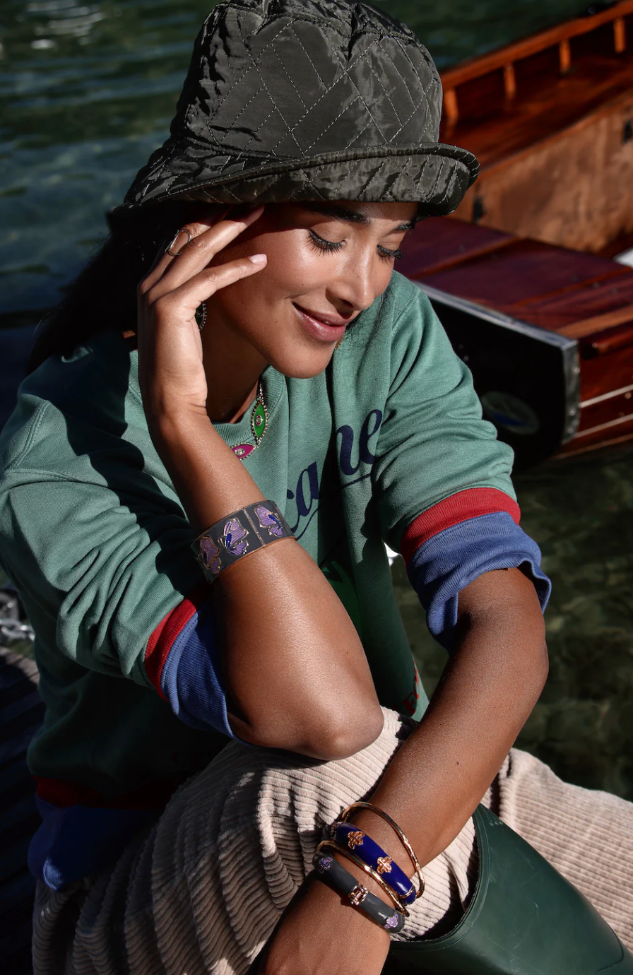 Dieser schöne Armreif von Argelouse wurde in Frankreich von Hand aus Messing und Email gefertigt. Das Schmuckstück bringt lebendigen Charme in Ihren Alltag und wirkt besonders eindrucksvoll, wenn es zusammen mit anderen Modellen der Marke getragen wird. Das Muster mit glücksbringenden Kleeblätter und leuchtenden Farben ist ein wunderschönes Glücksamulett.