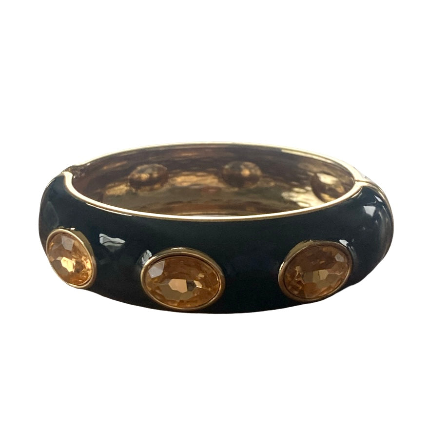 Dieser schwarze Armreif ist kunstvoll aus Messing und Email gefertigt und mit strahlenden beigen Glassteinen verziert. Er verleiht jedem Outfit lebendigen Charme und setzt besondere Akzente im Alltag. Besonders beeindruckend entfaltet er seine Wirkung, wenn er in Kombination mit anderen Schmuckstücken getragen wird, wodurch ein einzigartiger und stilvoller Look entsteht.