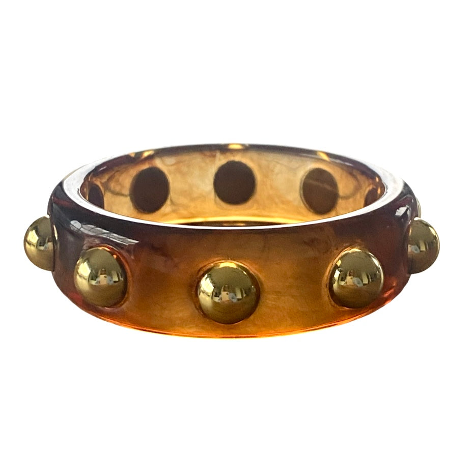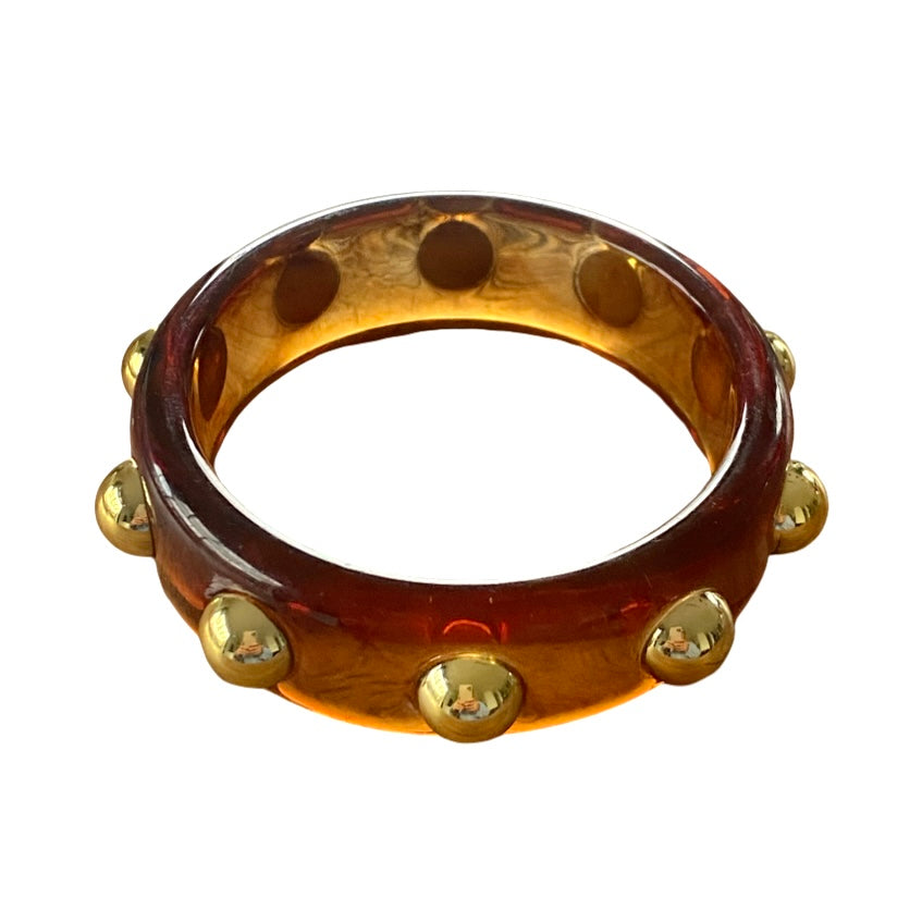 Dieses schöne Schmuckstück wurde aus Harz gefertigt und mit mehreren vergoldeten runden Nieten geschmückt. Es ist leicht durchscheinend und glänzt dabei wunderschön. Das Modell ist durchaus markant, aber auch schön leicht. Tragen Sie den dekorativen Armreifen wahlweise über dem Ärmel eines Hemds oder Pullovers.