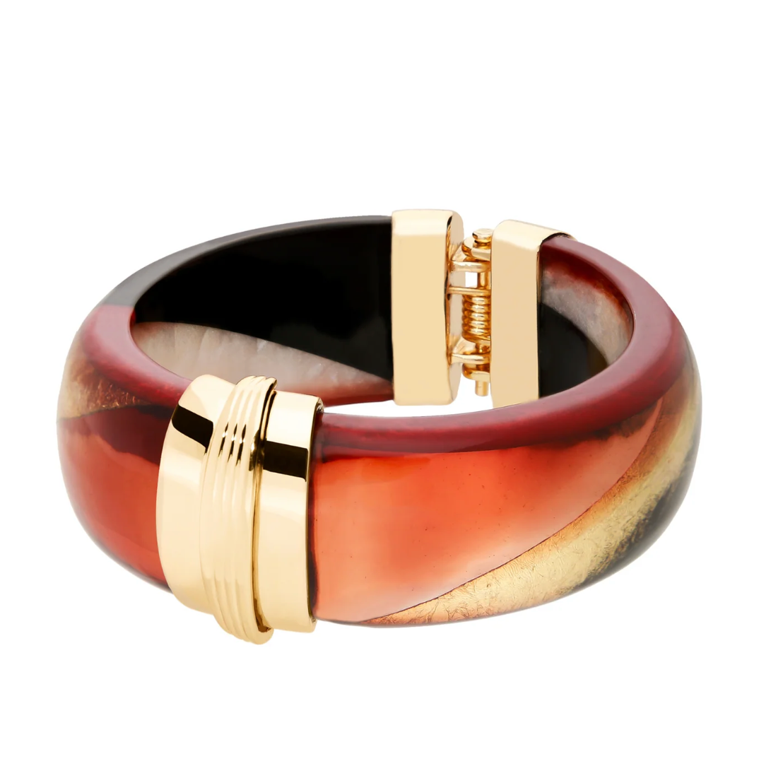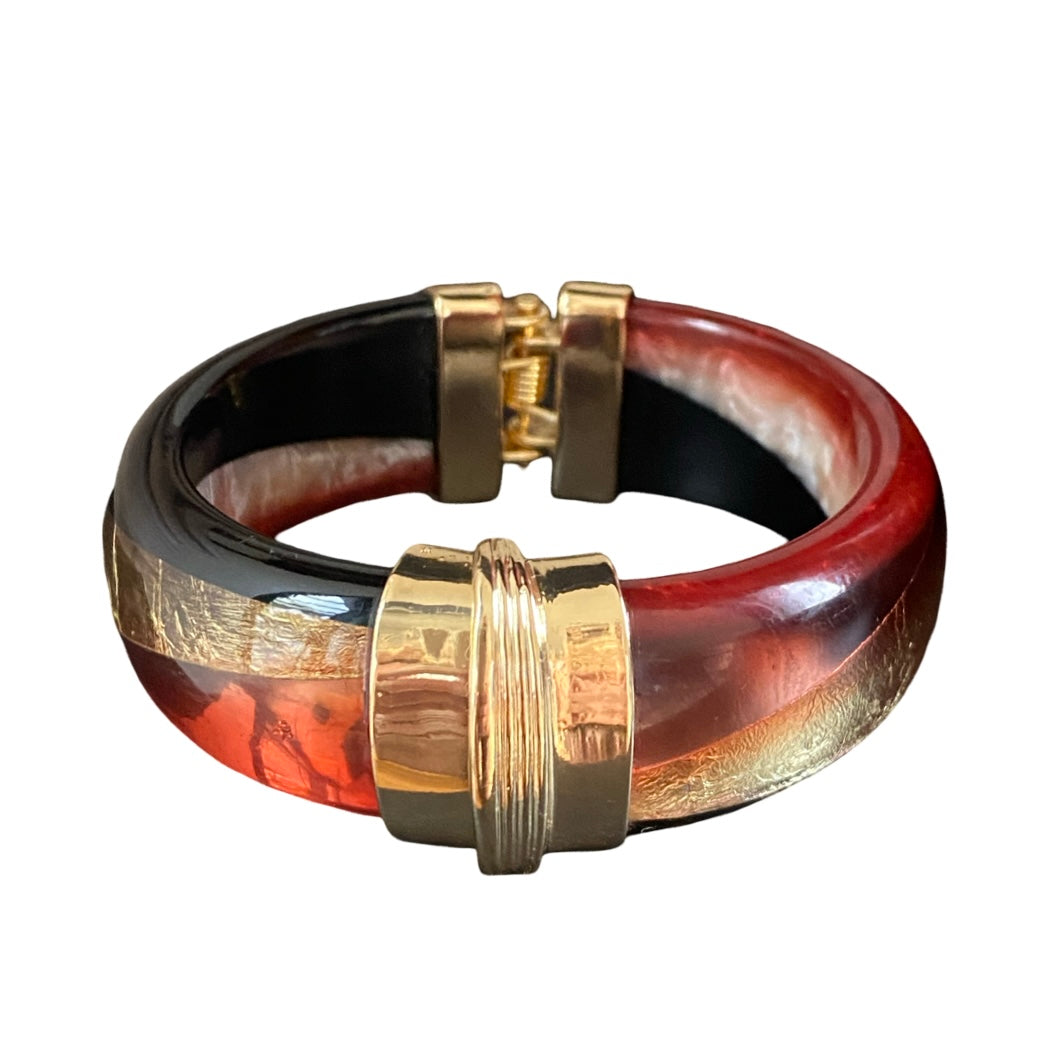 Dieser Armreif wurde aus Harz und Messing handgefertigt. Seine Farben erinnern an einen goldenen Strahl, der den Horizont streift und an die Indian Summer-Abende. Sein geriffeltes, vergoldetes Verschlusssystem ist ein zusätzlicher schöner Eyecatcher. Das moderne Schmuckstück wird Sie überall begleiten und lässt Ihre Handgelenke wie einen kostbaren Glanz der letzten Sonnenstrahlen der Saison erstrahlen.