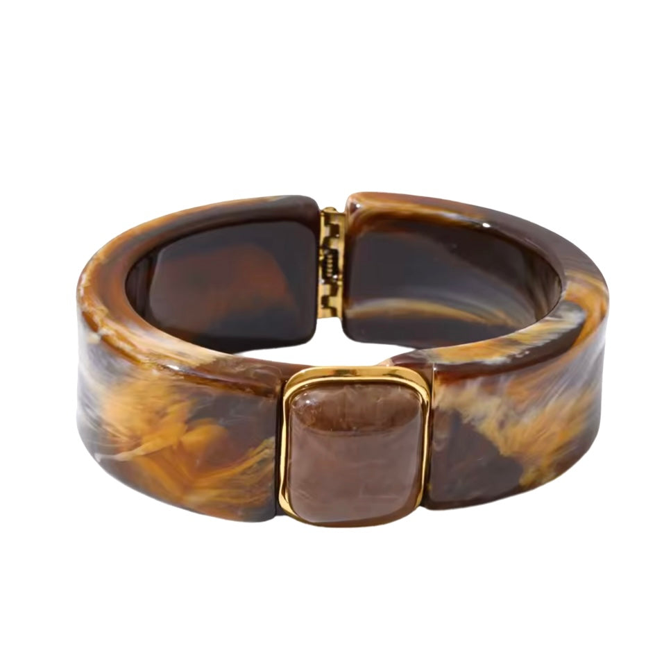 Dieser breite Armreif verströmt durch und durch zeitgenössisches Flair und setzt einen zeitgemässen Akzent. Das abgerundete Modell aus glänzendem Harz lässt sich dank des vielseitigen Brauntons zu praktisch allem tragen. Zusammen mit anderen Modellen getragen wirkt der Armreifen besonders eindrucksvoll und modern.