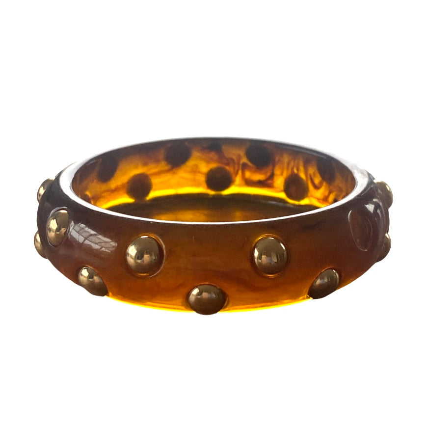 Dieses schöne Schmuckstück wurde aus Harz gefertigt und mit mehreren vergoldeten runden Nieten geschmückt. Es ist leicht durchscheinend und glänzt dabei wunderschön. Das Modell ist schön leicht. Tragen Sie den dekorativen Armreifen wahlweise über dem Ärmel eines Hemds oder Pullovers.