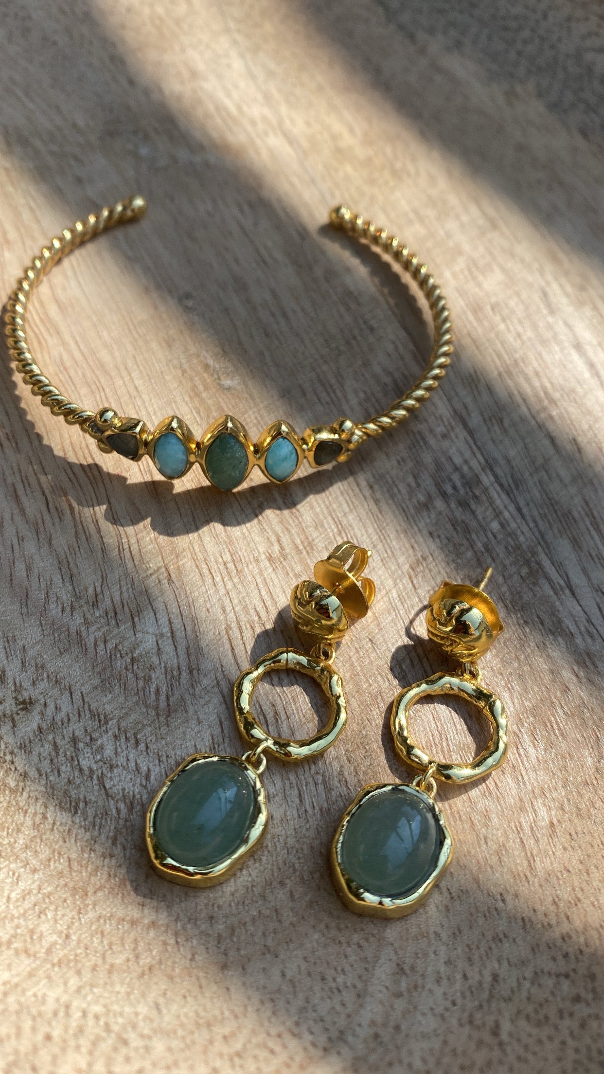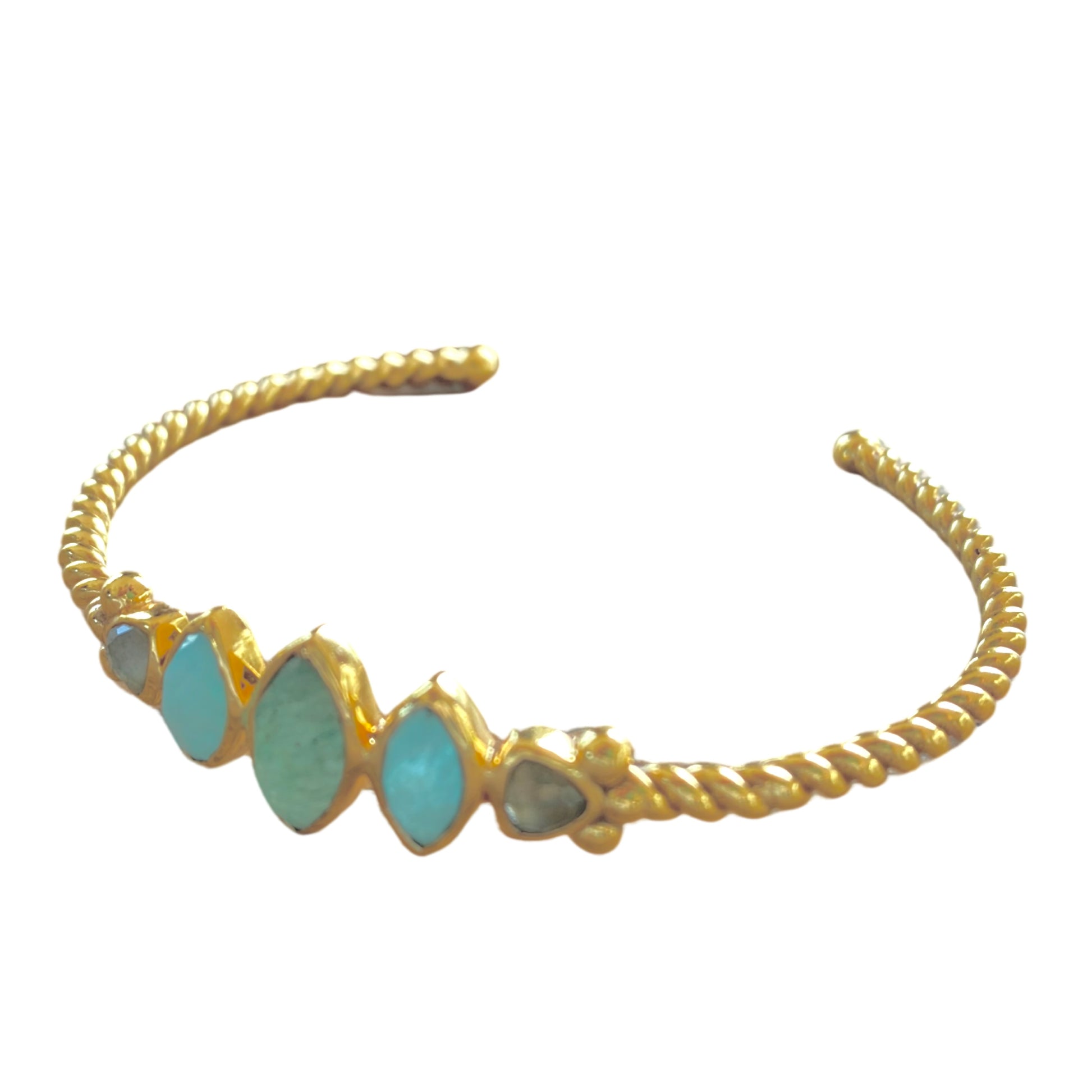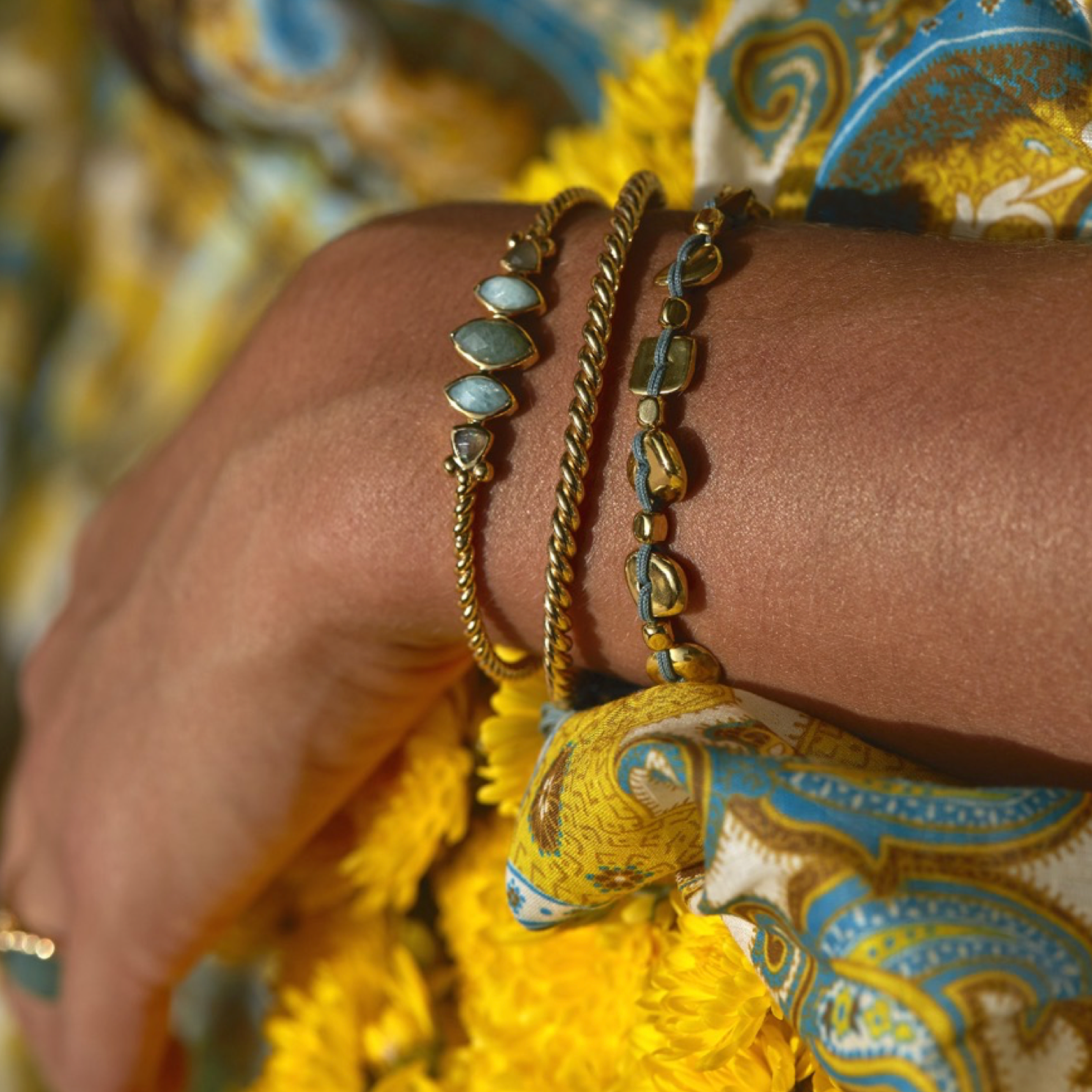 Für diese Armspange hat Pink Sand hochwertig verarbeitete Steine in wunderschönen Blautönen gewählt. Chalcedon- Amazonit- sowie Labradoritsteine zieren diese schmale Spange. Tragen Sie dieses wunderschöne und einzigartige Schmuckstücke alleine oder kombinieren Sie es mit den passenden Ohrringen Ciel d'Été.