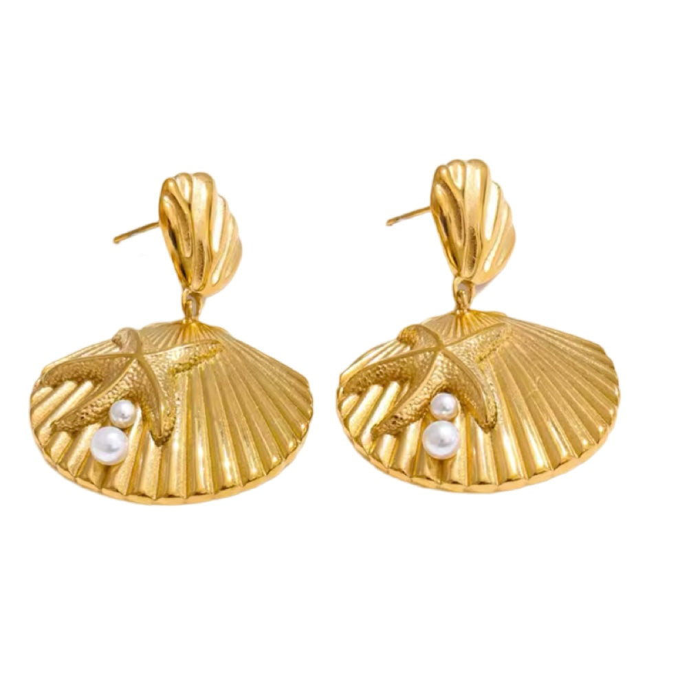 Diese Ohrringe zeichnen sich durch Stecker sowie Anhänger in Form einer Muschel aus. Das Paar wurde aus vergoldetem Messing gefertigt und ebenfalls mit dezenten Verbindungselementen gestaltet, dank derer es in der Bewegung sanft mitschwingt.