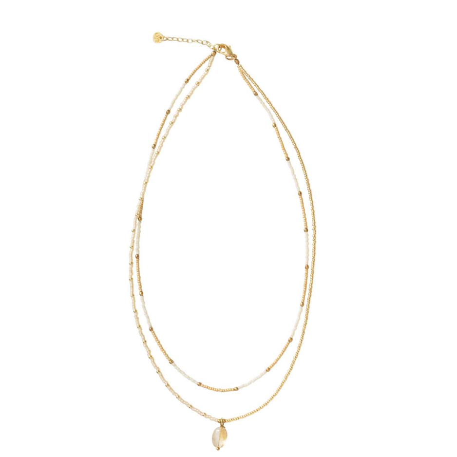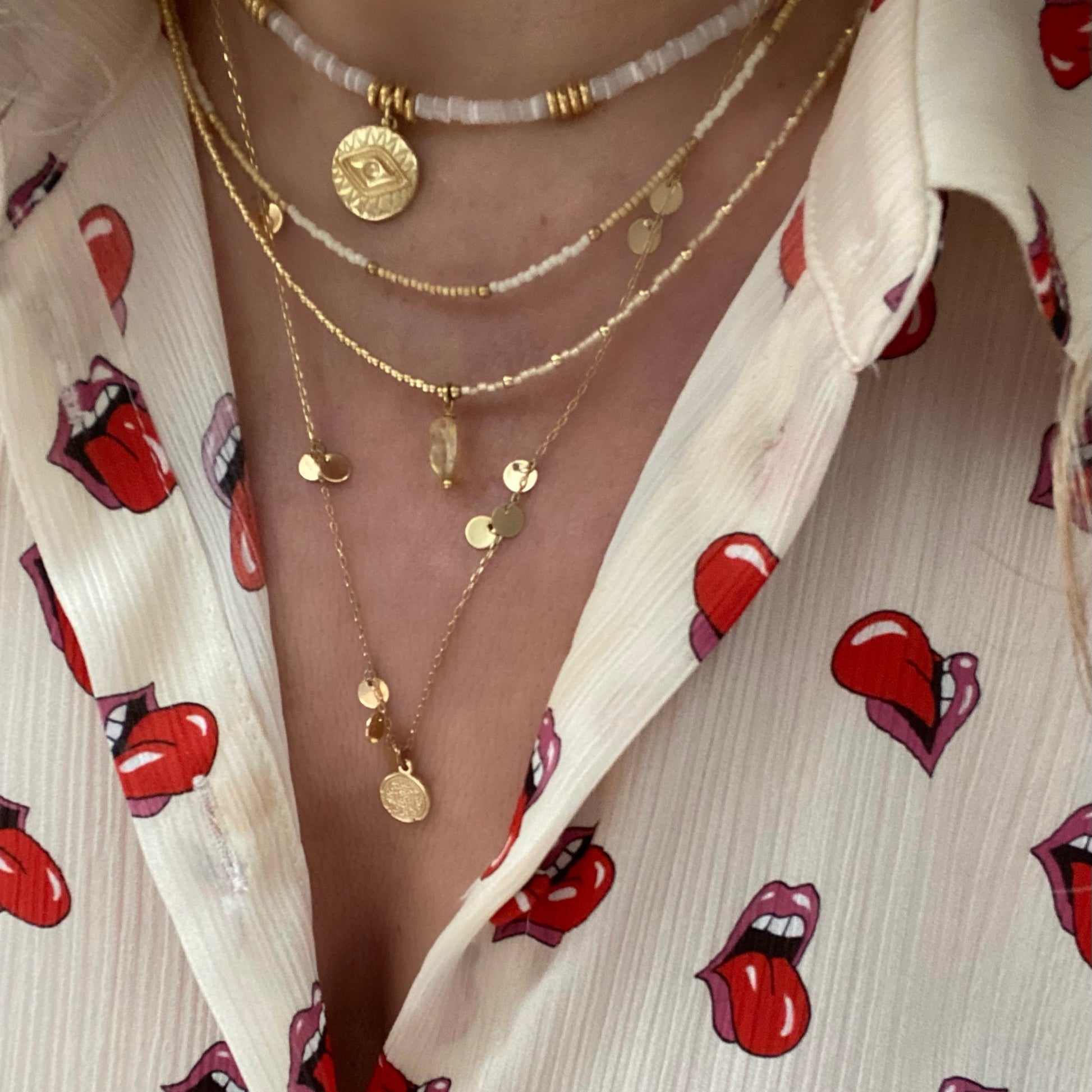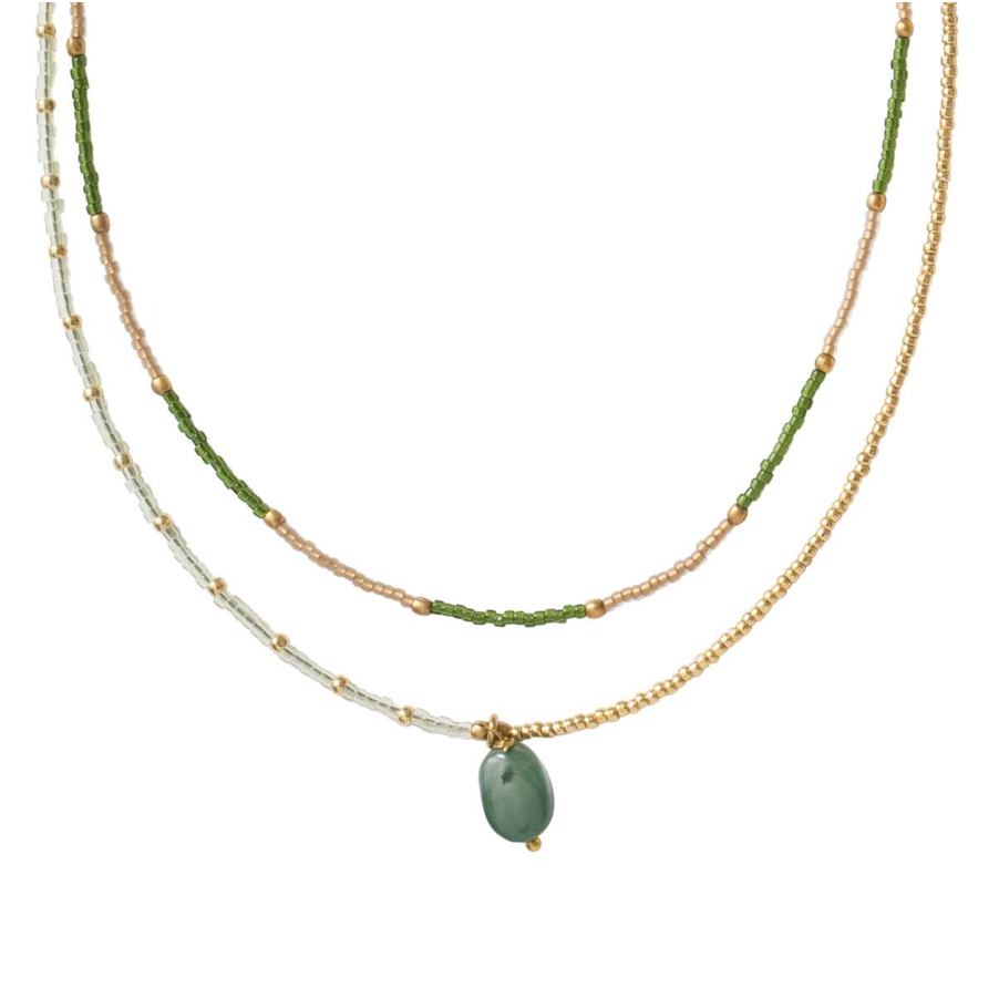 Diese Halskette - es sind eigentlich zwei - wurde aus farbigen Glasperlen und Messingperlen handgefertigt und mit einem grossen Edelstein veredelt. Tragen Sie diese schöne Halskette alleine oder kombinieren Sie sie mit einem längeren Modell, um den Layering-Effekt zu erzielen.