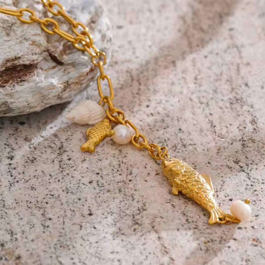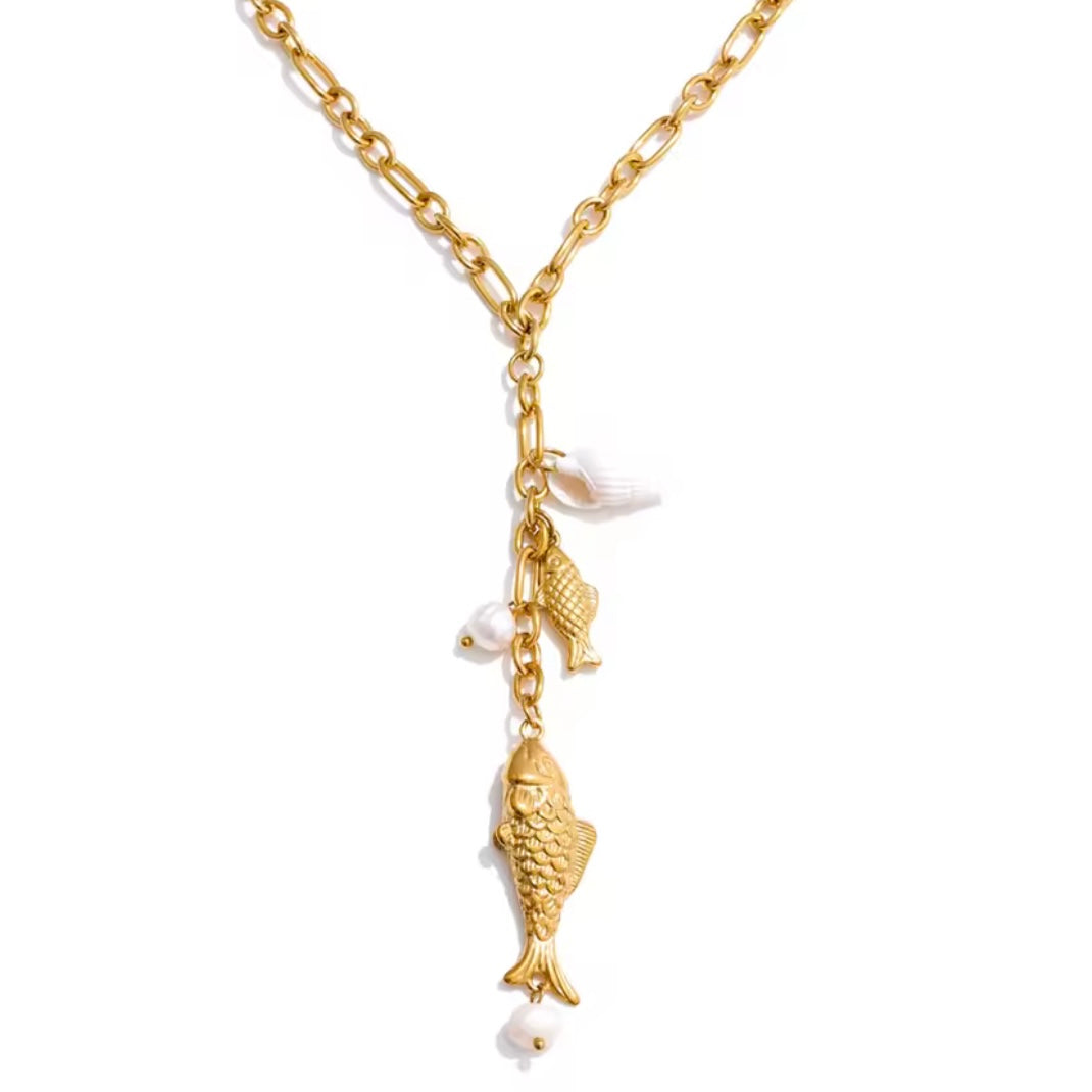 Diese lange Y-Kette möchte die Sehnsucht nach dem Sommer gestalterisch aufgreifen. Das Schmuckstück fällt ansprechend und wurde mit Muschel- und Anhänger in Fischform sowie Kunstperlen verziert – kleine Schätze, die auch im Meer zu finden wären. Die tolle Kette kommt eindrucksvoll zur Geltung wenn Sie es zu einem tiefen Ausschnitt tragen.