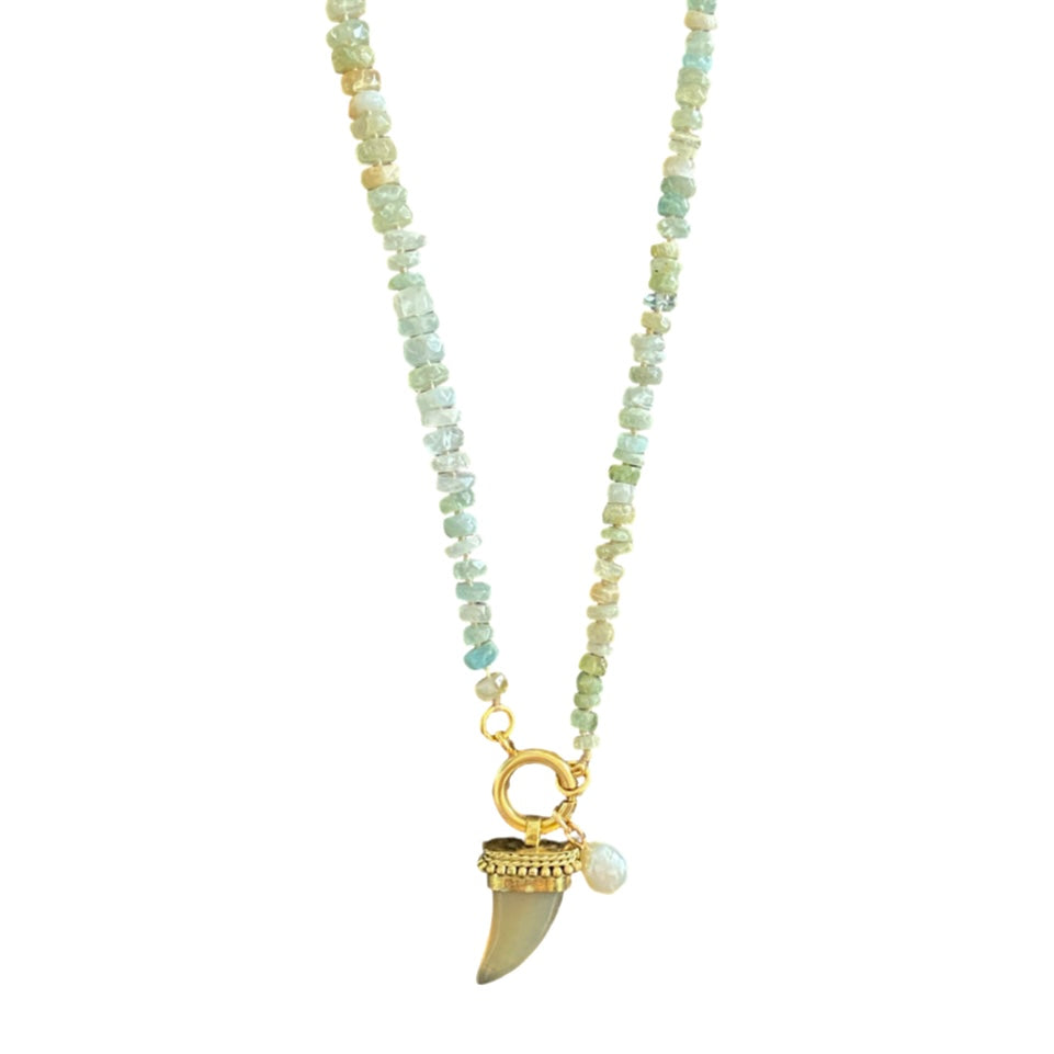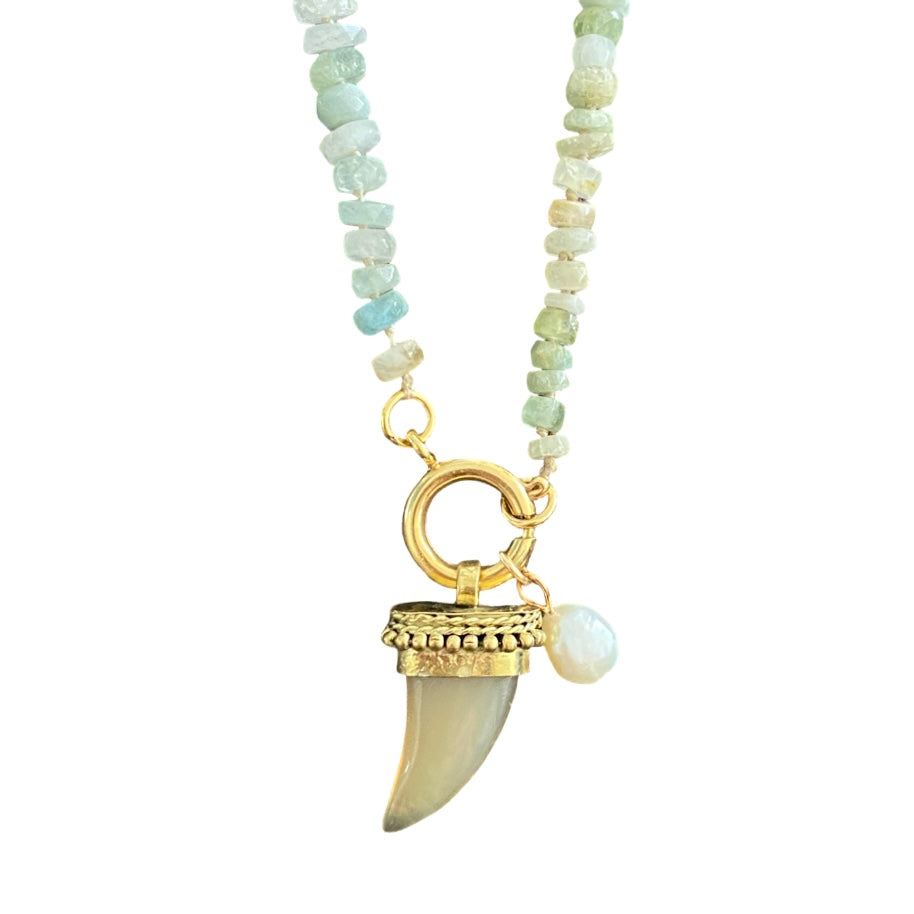 Jeder Edelstein dieser wunderschönen handgeknüpften Halskette von Pink Sand wurde von Hand ausgesucht. Das Accessoire wurde mit viel Liebe zum Detail aus Aquamarinsteinen handgefertigt und zeigt sich mit einem Hornanhänger und einer kleinen Süsswasserperle. Tragen Sie diese tolle Halskette alleine oder kombinieren Sie das Modell mit anderen Alltagsfavoriten.
