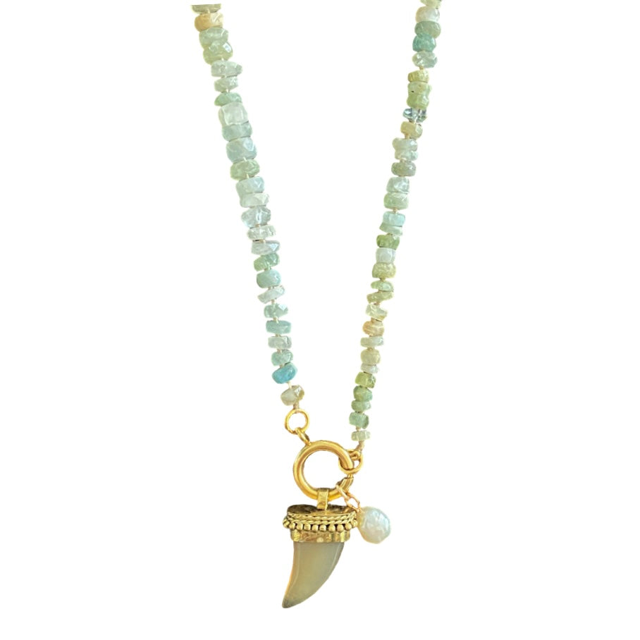 - Material: Aquamarin, Horn, Süsswasserperle, Messing