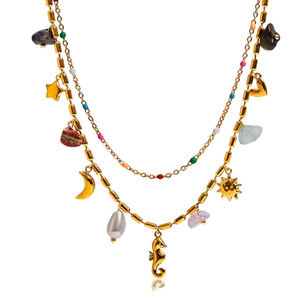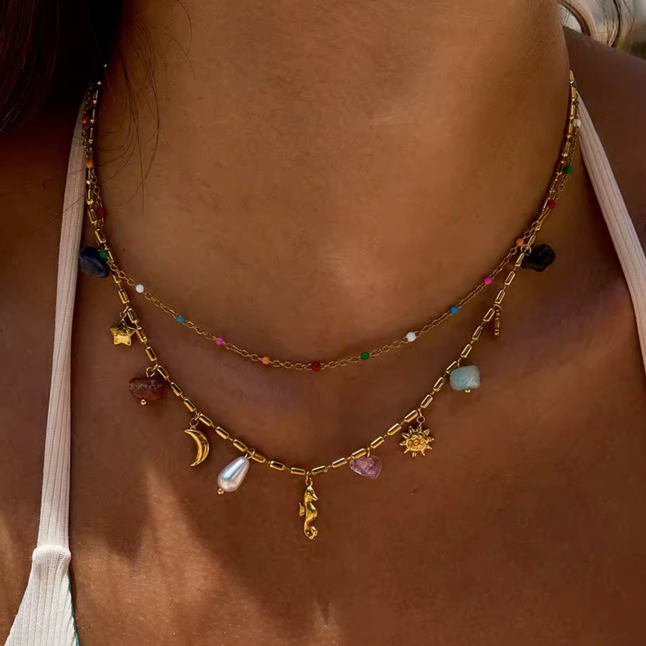 Diese zweireihige Halskette besteht aus zwei unterschiedlichen Strängen – einer zarten Kette mit farbenfrohen Perlen und einer Kette mit Charms-Anhängern. Jeder Anhänger hat ein einzigartiges Design, das den verspielten Look unterstreicht. Die verstellbare Länge und der Karabinerverschluss ermöglichen eine individuelle Passform.