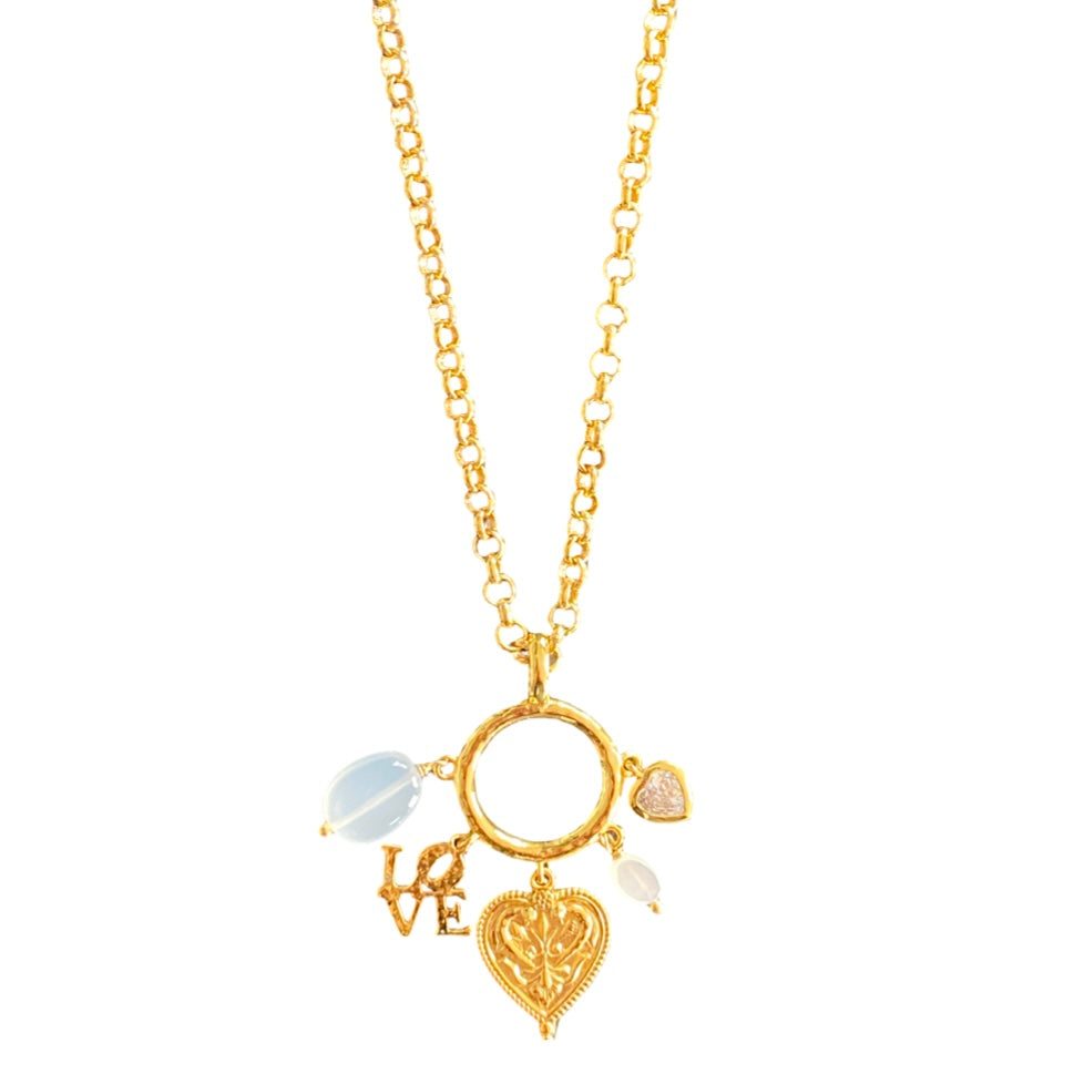Diese Halskette aus der neuen Kollektion von Pink Sand wurde aus vergoldetem Messing handgefertigt und mit mehreren Anhängern gestaltet, die Liebe in ihren verschiedenen Ausprägungen symbolisieren: einem Herzen, dem Schriftzug LOVE, zwei Edelsteinen sowie einem eingefassten Zirkonia in Form eines Herzchen. Aufgrund der romantischen Nuance eignet es sich vorzüglich als Hochzeits- oder Jubiläumsgeschenk.