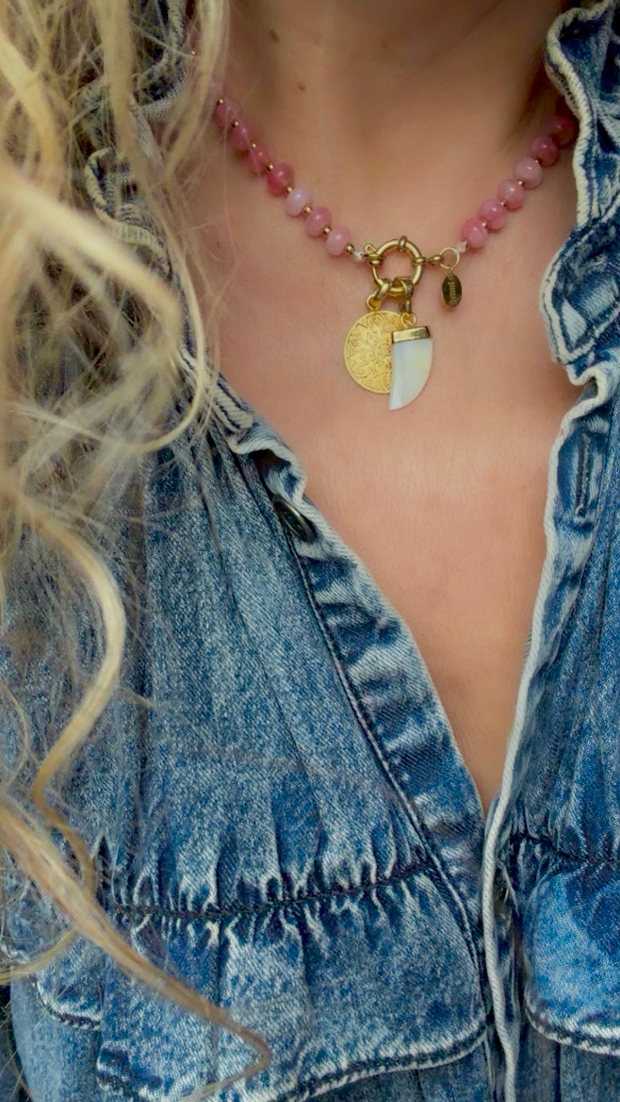 Diese kurze Halskette setzt sich aus farbenfrohen, facettierten Rhodonitperlen zusammen und wurde mit zwei schönen Anhängern geschmückt. Tragen Sie dieses Schmuckstück alleine oder kombinieren Sie es mit anderen Varianten.