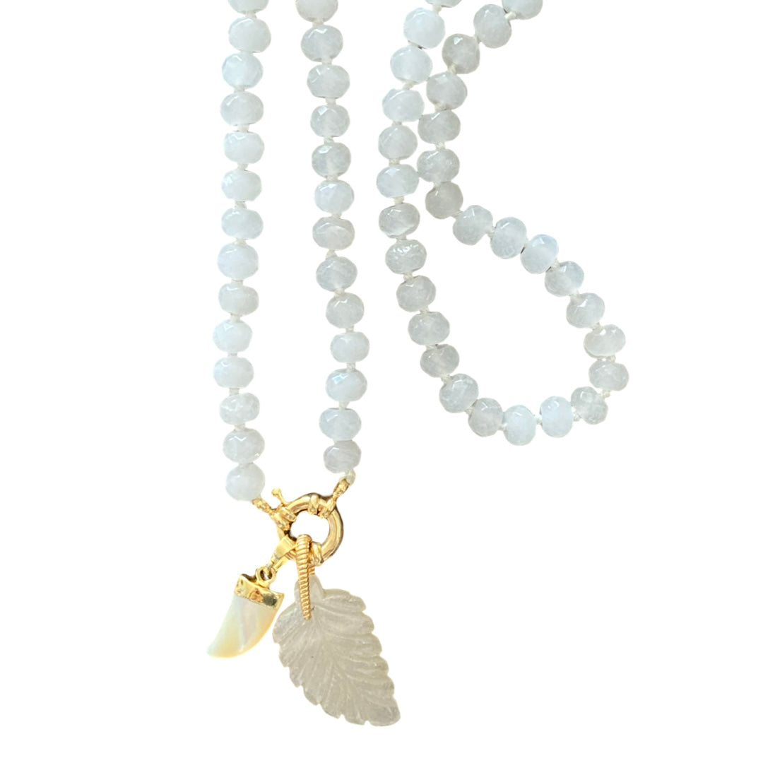 Diese handgeknüpfte lange Halskette ist mit facettierten weissen Halbedelsteinen gearbeitet und wurde mit zwei passenden Anhänger geschmückt. Der weisse Chalcedon dieser Halskette wirkt immer natürlich und zurückhaltend und passt zu jedem Outfit.