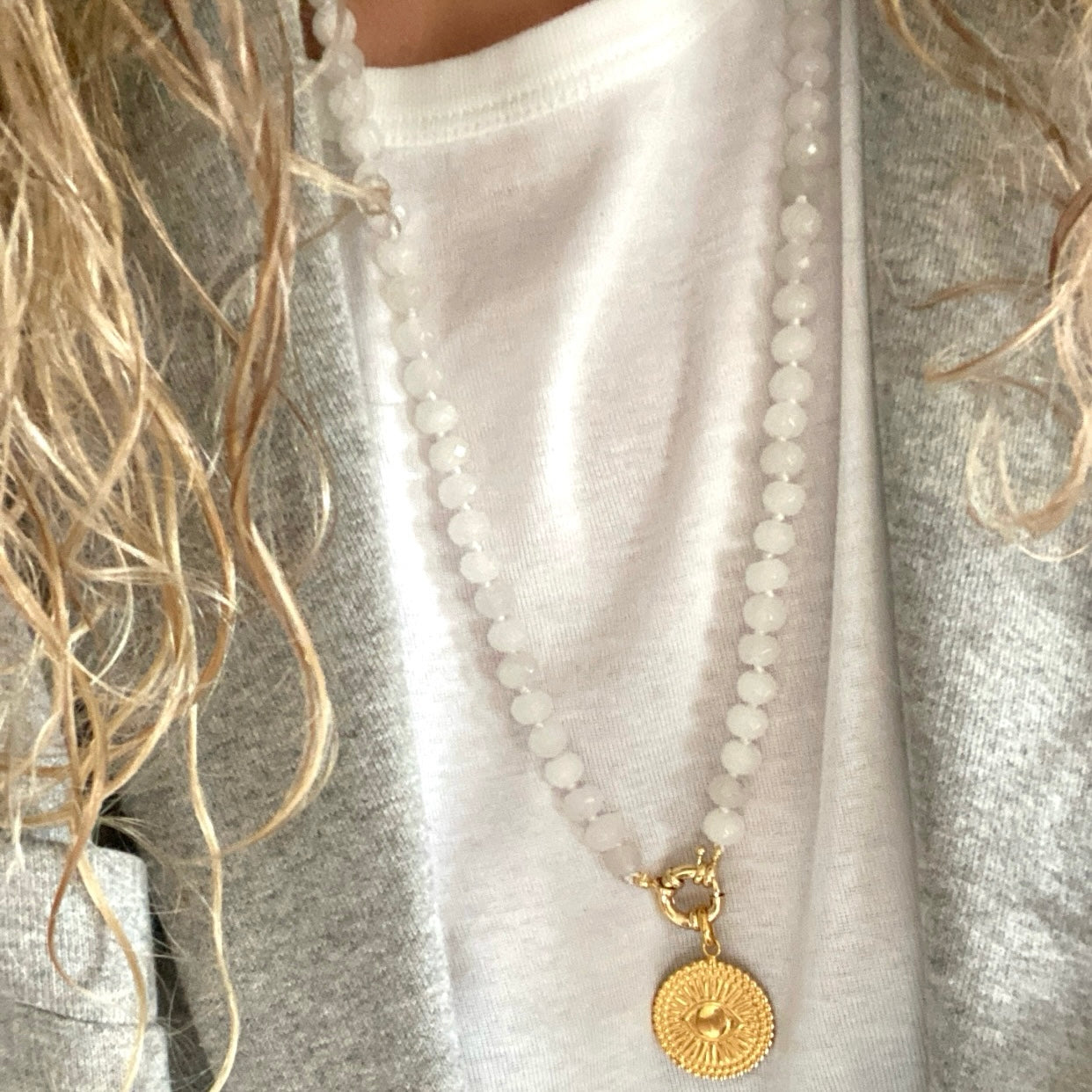 Diese handgeknüpfte lange Halskette ist mit facettierten weissen Halbedelsteinen gearbeitet und wurde mit einem runden Silbermedaillon mit einem Augenmotiv geschmückt. Das Schutzauge wird in vielen Kulturen alsTalisman getragen. Der weisse Chalcedon dieser Halskette wirkt immer natürlich und zurückhaltend und passt zu jedem Outfit.