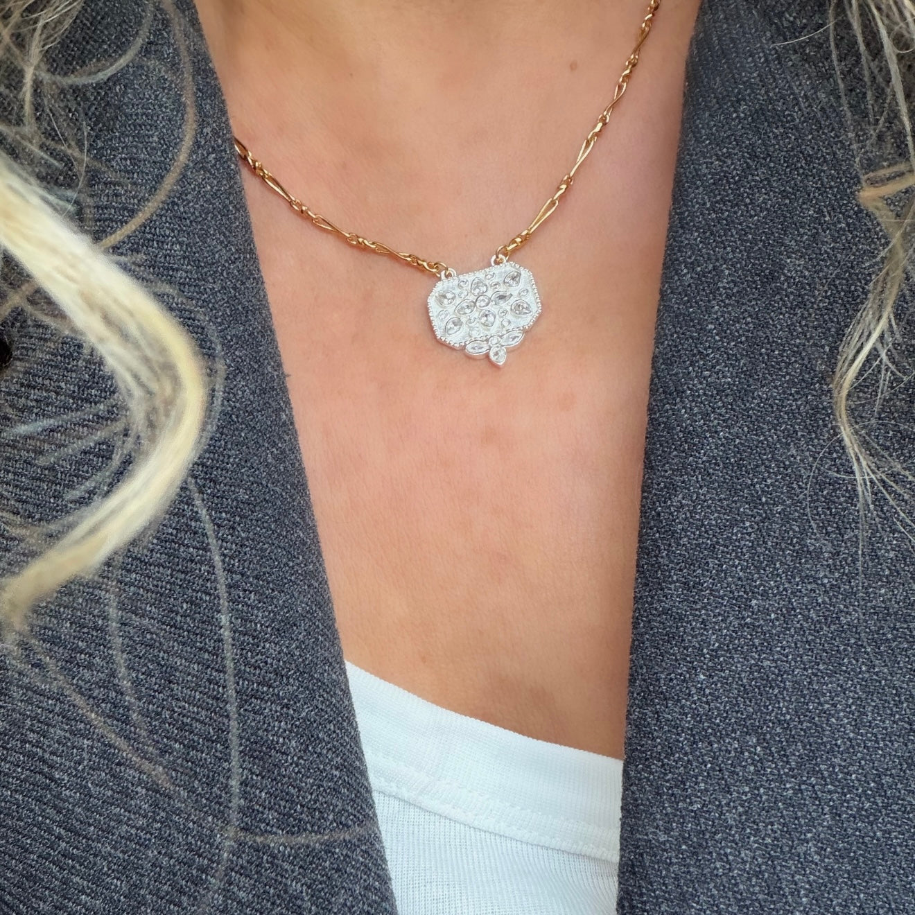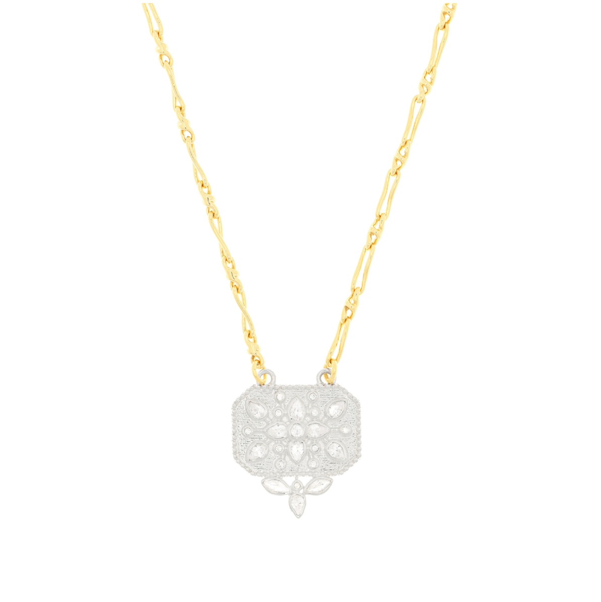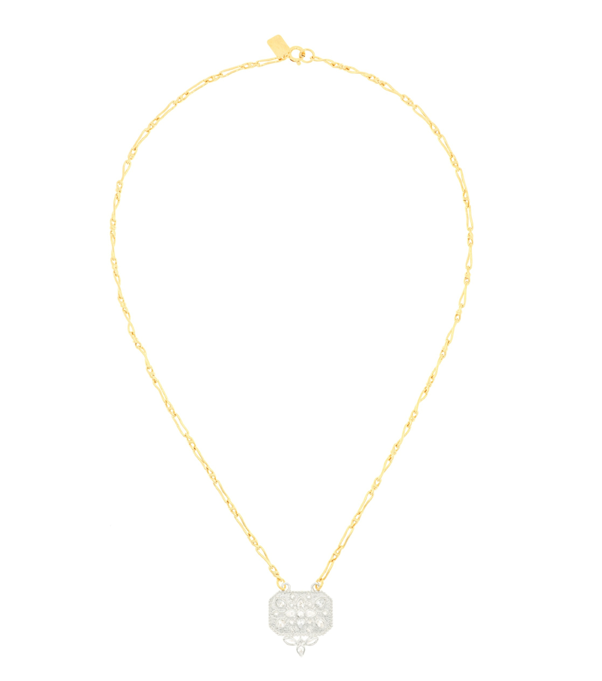 Diese zweifarbige Halskette von DELPHES Paris wurde aus vergoldetem Messing handgefertigt und mit einem versilberten Anhänger geschmückt.