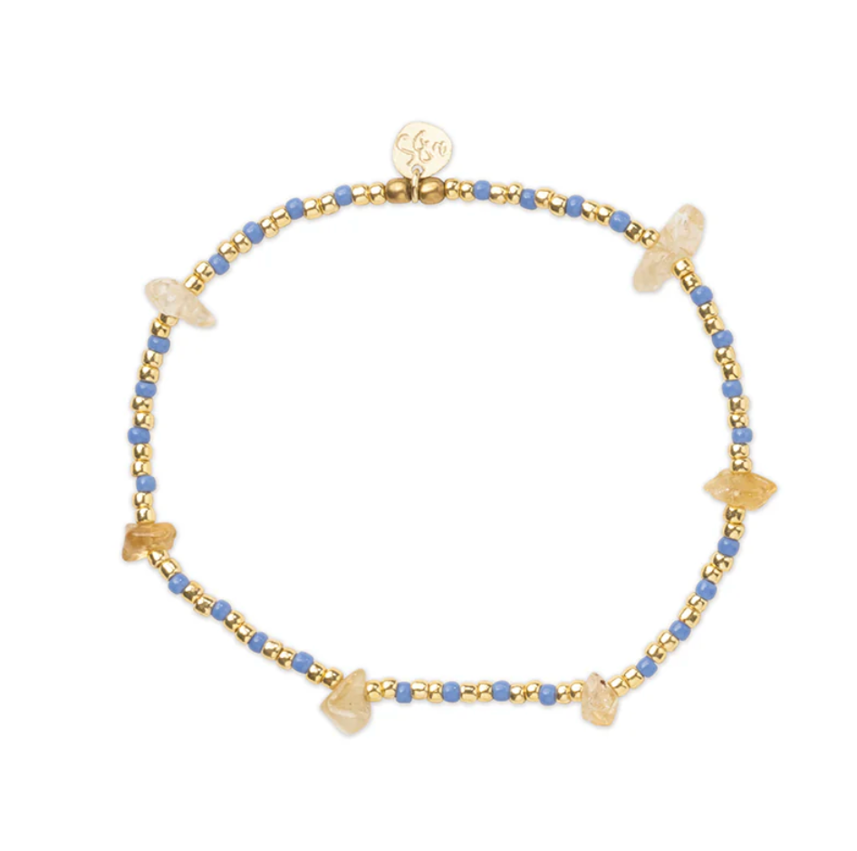 Dieses Armband von A beautiful Story wurde aus Messing- und Glasperlen handgefertigt und mit kleinen Edelsteinen verziert. Die positive Energie der Citrin-Chips verleiht Ihnen das Gefühl, die Sonne den ganzen Tag bei sich zu tragen.