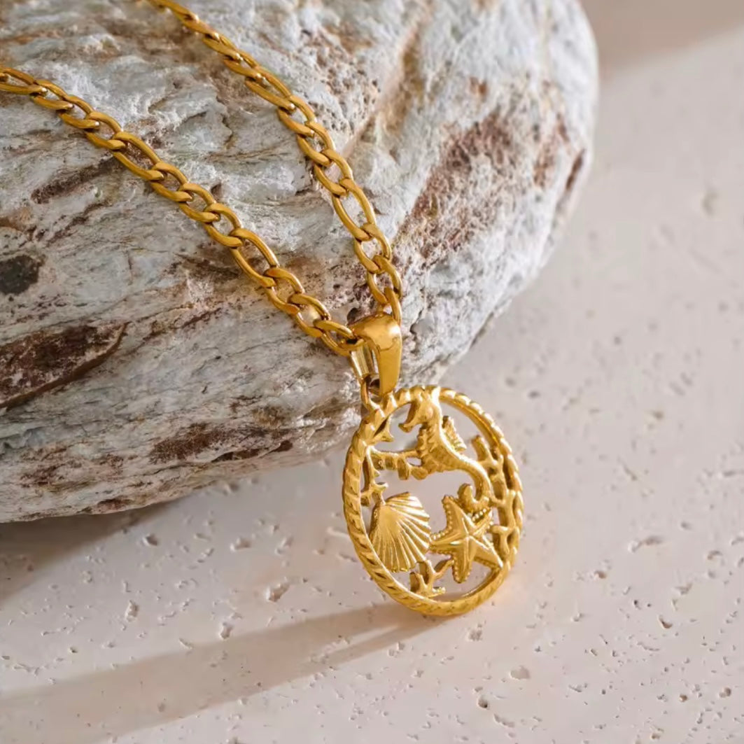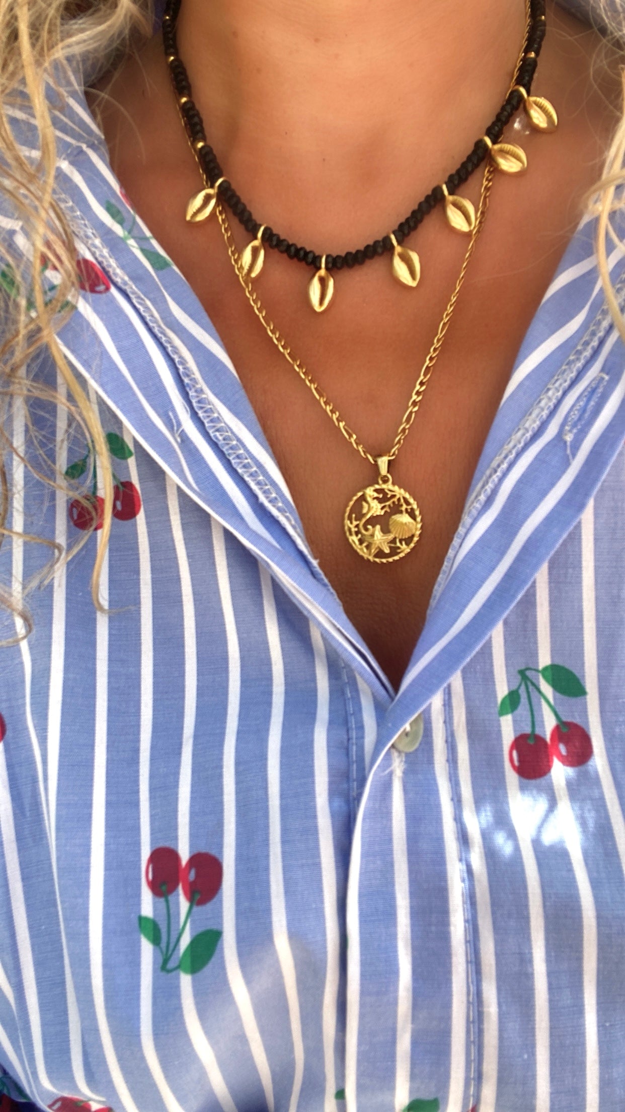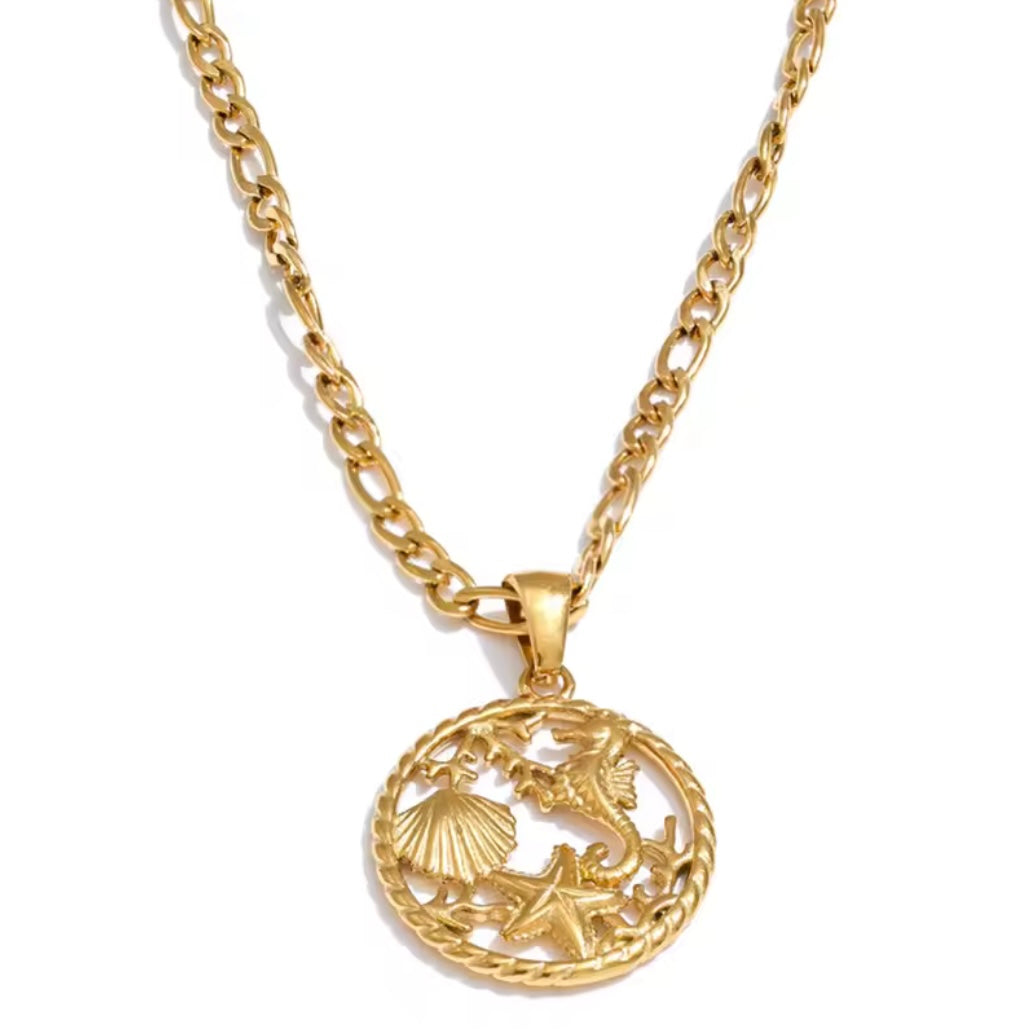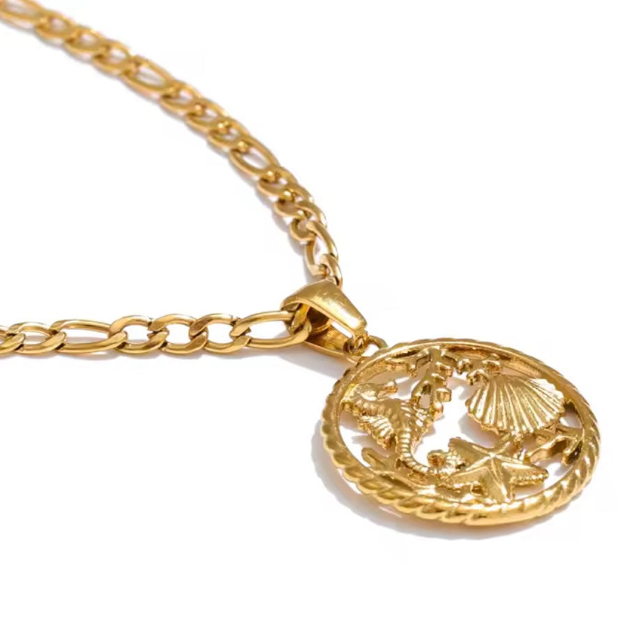 Diese in der Länge verstellbare Kette besteht aus goldfarbenem Messing und zeichnet sich durch einen schönen, runden Anhänger mit Meeresbewohner aus. Tragen Sie sie zusammen mit anderen Schmuckstücken im maritimen Stil.