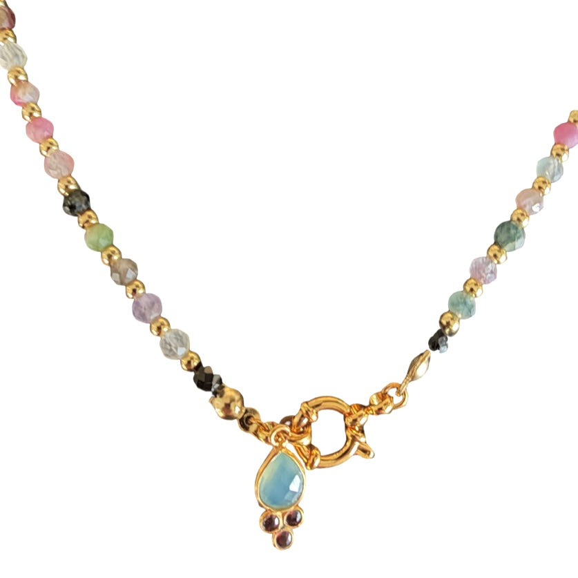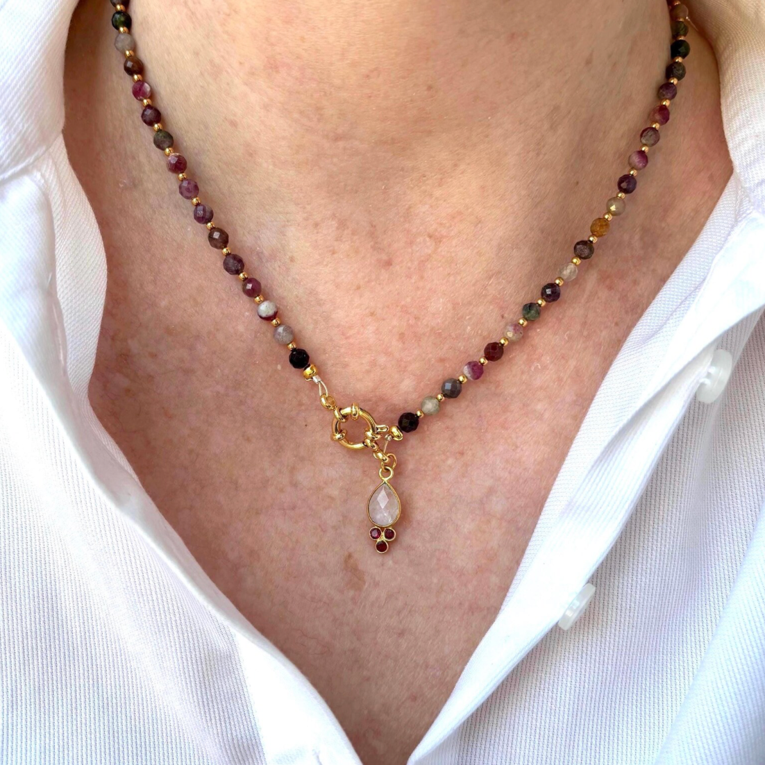 Diese schöne, handgefertigte Halskette zeigt sich mit Turmalinen. Jenem Stein werden seit langem beruhigende Eigenschaften nachgesagt, zudem soll er Stress und Ängste lindern. Das Schmuckstücke wurde mit einem kleinen, zarten Anhänger geschmückt. Integrieren Sie diese schöne Kette in Ihren Alltagslook.