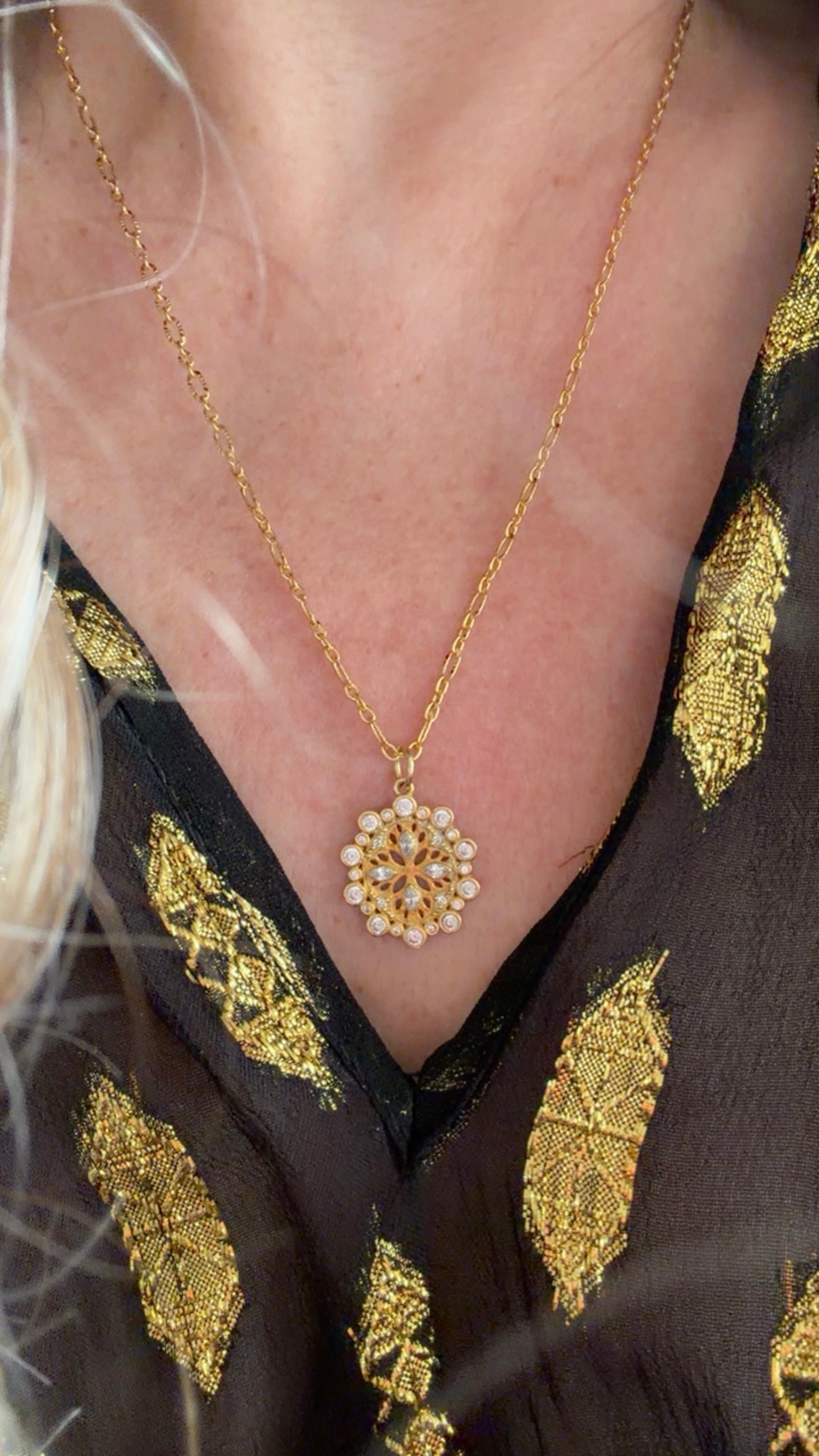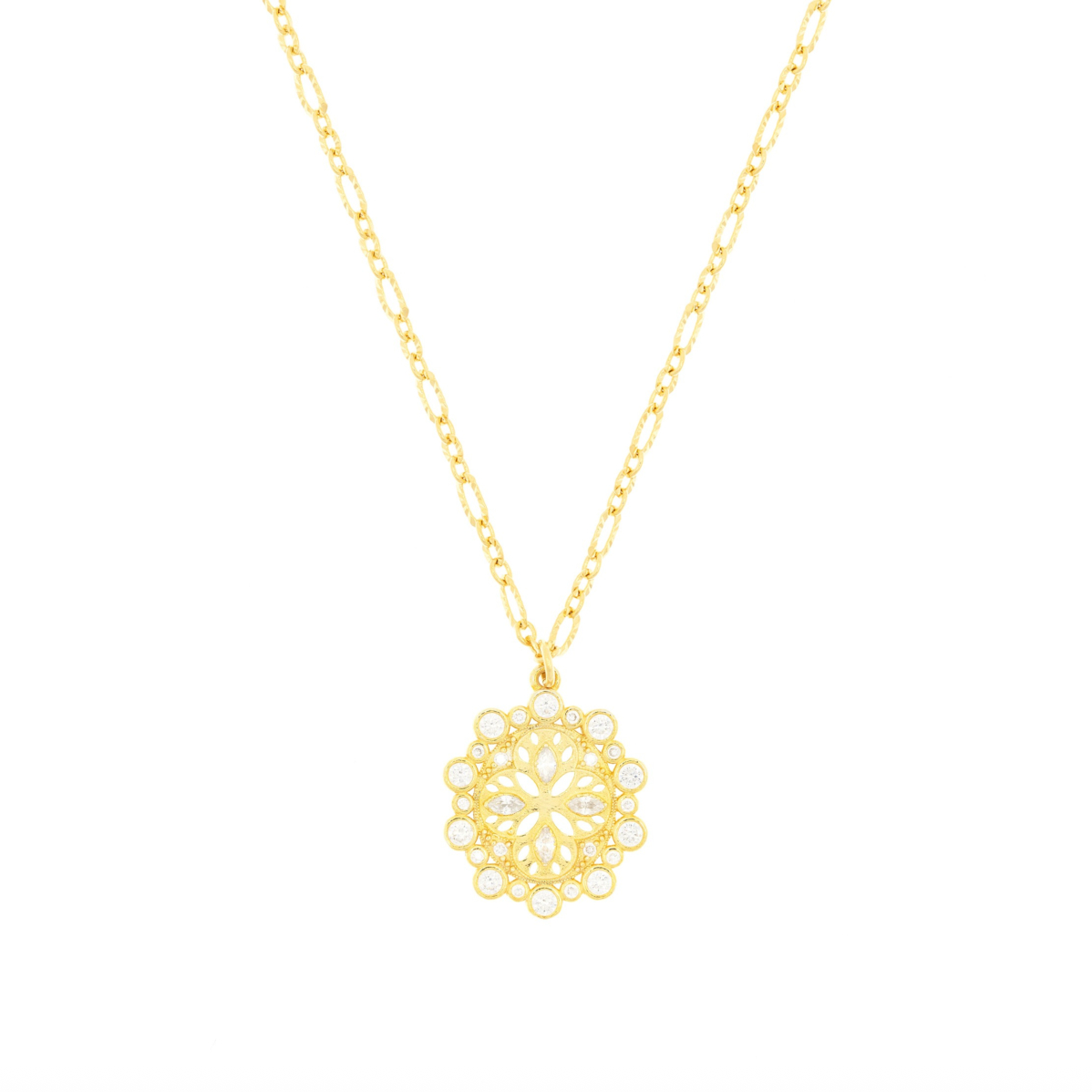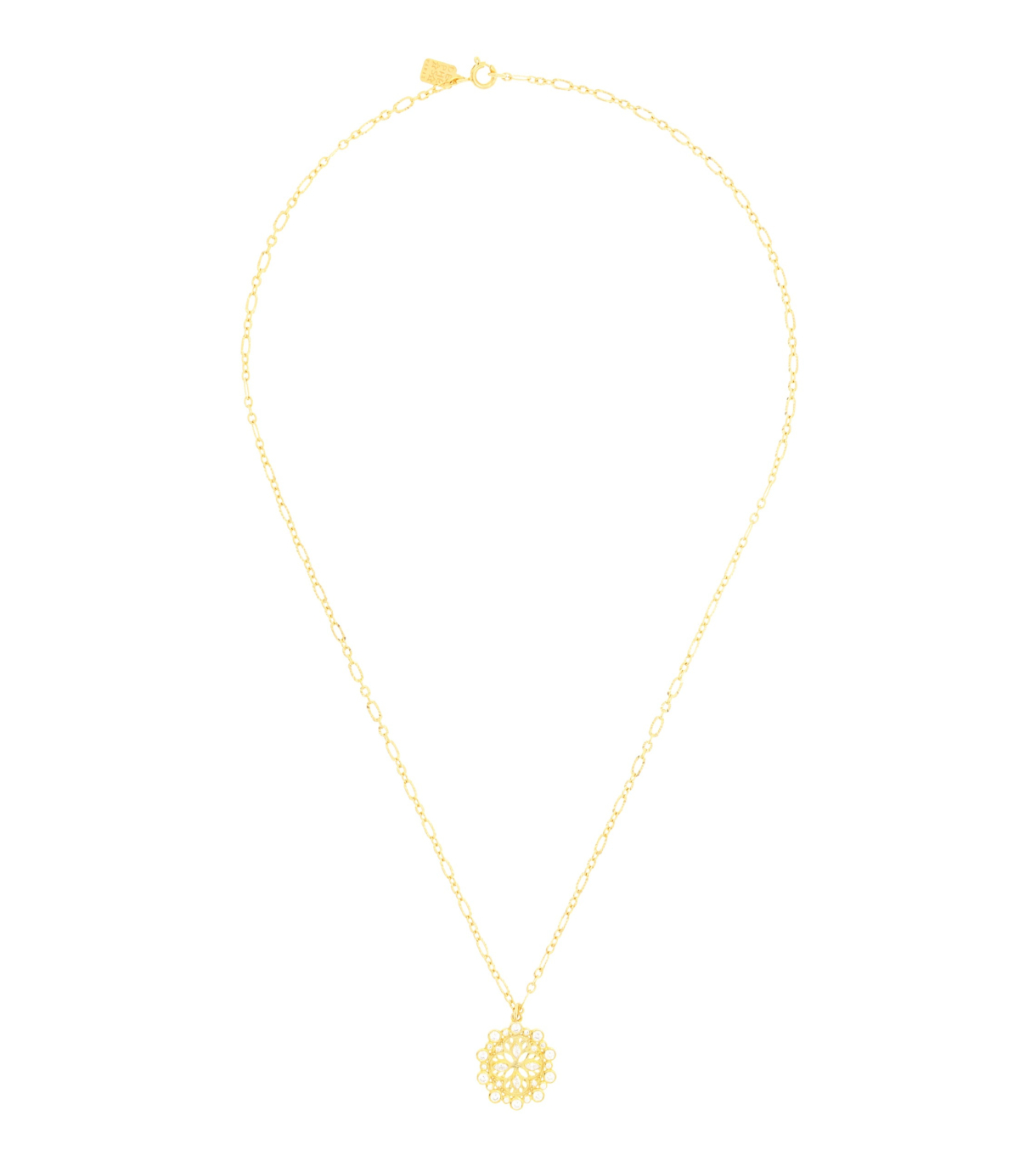 Diese Halskette von DELPHES Paris wurde aus vergoldetem Messing handgefertigt und mit einem schönen runden Blumen-Anhänger geschmückt. Das florale Design symbolisiert Harmonie, Wachstum und Schutz. Tragen Sie diesen schönen Glücksbringer immer bei sich.