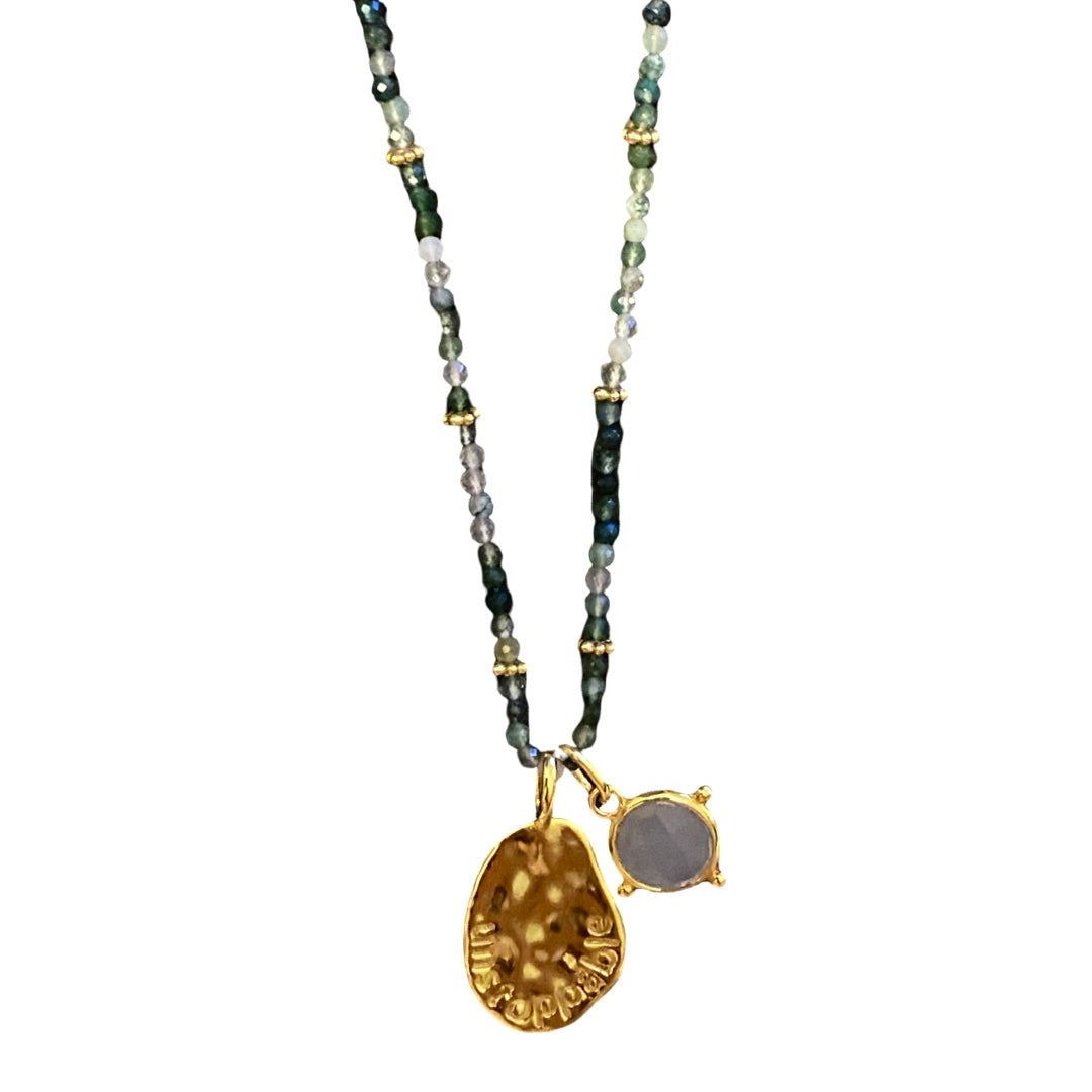 Diese lange Halskette aus der neuen Kollektion von Argento Furioso wurde vollständig von Hand aus grünen Achatsteinen gefertigt. Ein vergoldeter Anhänger mit dem Wort UNSTOPPABLE und ein kleiner Mondstein ergänzen das Design. Der Anhänger beschreibt ein Zustand der unbeirrbaren Entschlossenheit, bei dem man Hinternissen trotz, seine Ziele verfolgt und ein starkes Selbstvertrauen entwickeln. Die Kette eignet sich perfekt für besondere Anlässe oder als tägliches Schmuckstück. Kombinieren Sie das Schmuckstück mit kürzeren Modellen.