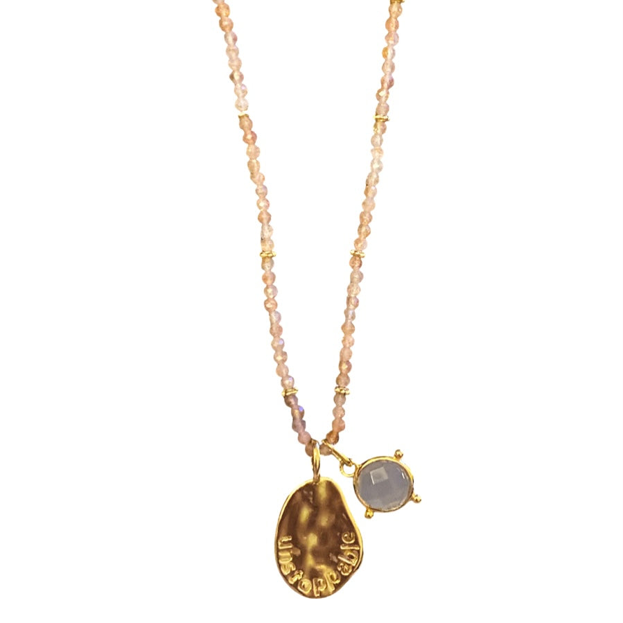 Diese lange Halskette aus der neuen Kollektion von Argento Furioso wurde vollständig von Hand aus rosa Jaspissteinen gefertigt. Ein vergoldeter Anhänger mit dem Wort UNSTOPPABLE und ein kleiner Mondstein ergänzen das Design. Der Anhänger beschreibt ein Zustand der unbeirrbaren Entschlossenheit, bei dem man Hinternissen trotz, seine Ziele verfolgt und ein starkes Selbstvertrauen entwickeln. Die Kette eignet sich perfekt für besondere Anlässe oder als tägliches Schmuckstück. Kombinieren Sie das Schmuckstück mit kürzeren Modellen.