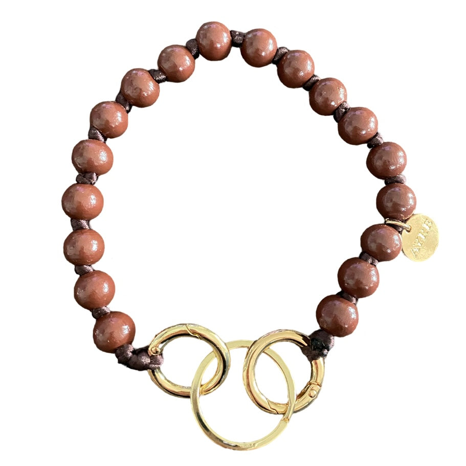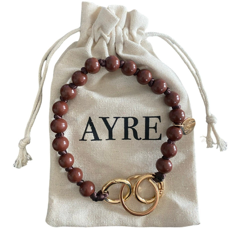 Dieses Accessoire von AYRE ist nicht nur stilvoll sondern auch äusserst praktisch und multifunktional. Es kann sowohl als Handykette als auch als Schlüsselanhänger benutzt werden und sorgt für ein lässiges Design. Es wurde aus hochwertigen Holzperlen gefertigt, handgeknüpft und mit einem goldenen Logo versehen, das für Qualität und schönes Design steht. Das Accessoire verfügt jeweils über zwei goldene Karabinerringe, an denen Sie Ihre Schlüssel sicher und einfach befestigen können. Für diejenigen, die lieber eine kürzere Handykette möchten, kann die Kette mithilfe des mitgelieferten Patch an eine Handyhülle angebracht werden.
