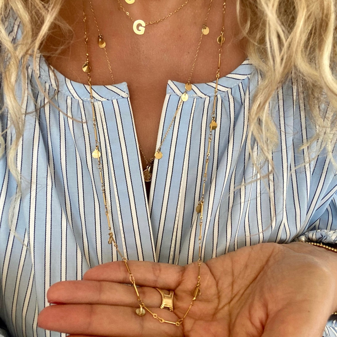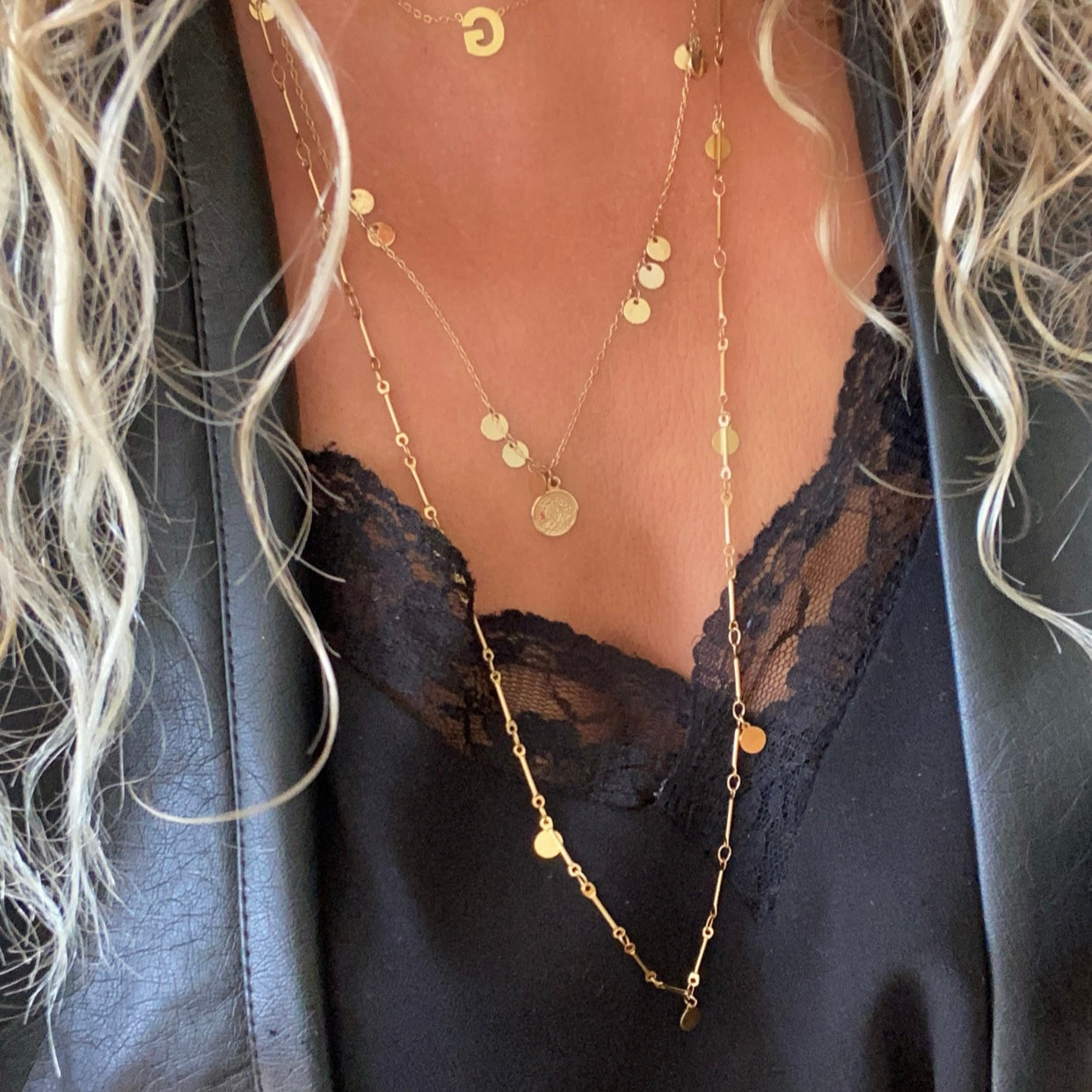 Diese zarte, lange Halskette wurde von Hand gefertigt. Sie zeigt sich mit kleinen Münz-Anhängern. Besonders toll wirkt sie, wenn Sie dazu kürzere Modelle tragen.