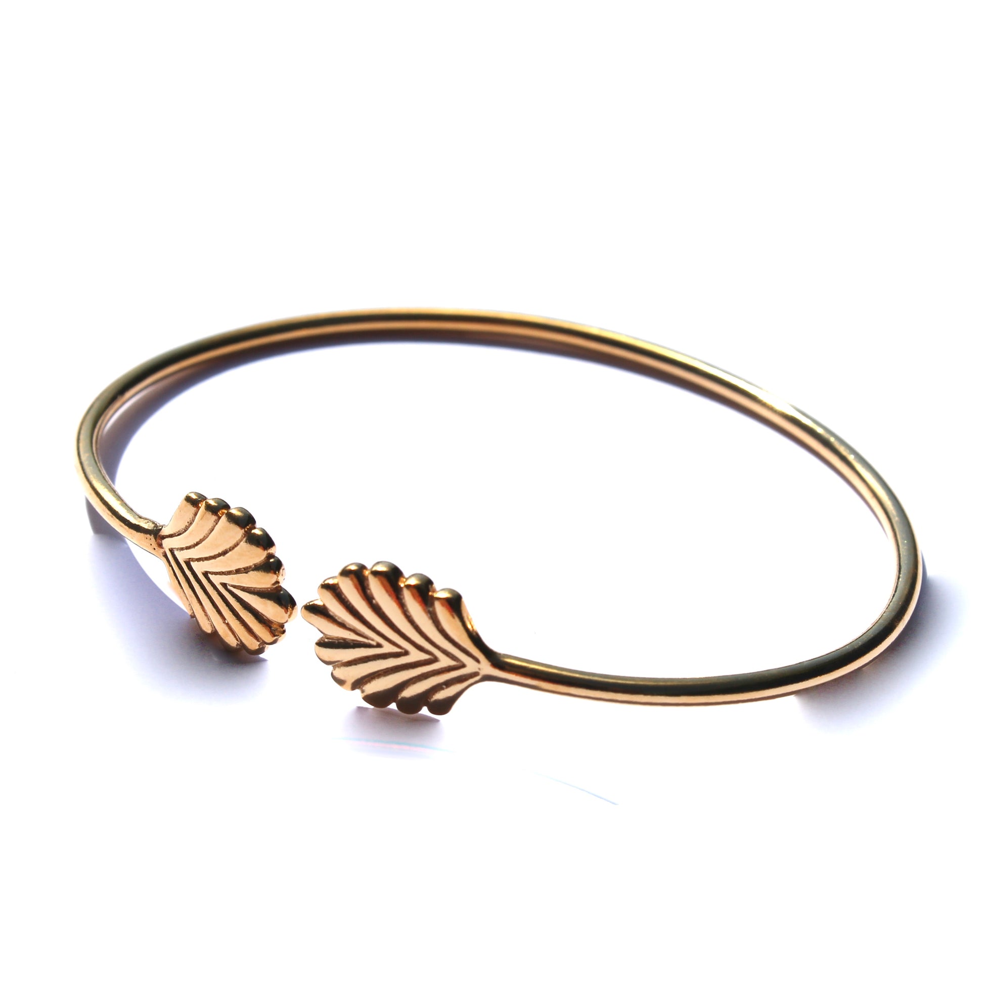 Ein zauberhaftes Zusammenspiel von Form und Bewegung zeigt sich im Design dieser zarten Armspange, die von Hand aus vergoldetem Messing gefertigt wurde. Das Hauptaugenmerk liegt hier auf die zwei vergoldeten Palmblätter. Dank des flexiblen Reifs können Sie das aparte Schmuckstück ganz einfach um Ihr Handgelenk legen.