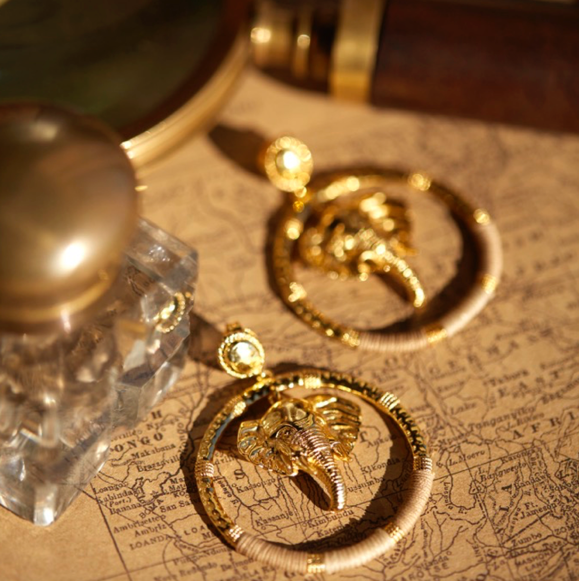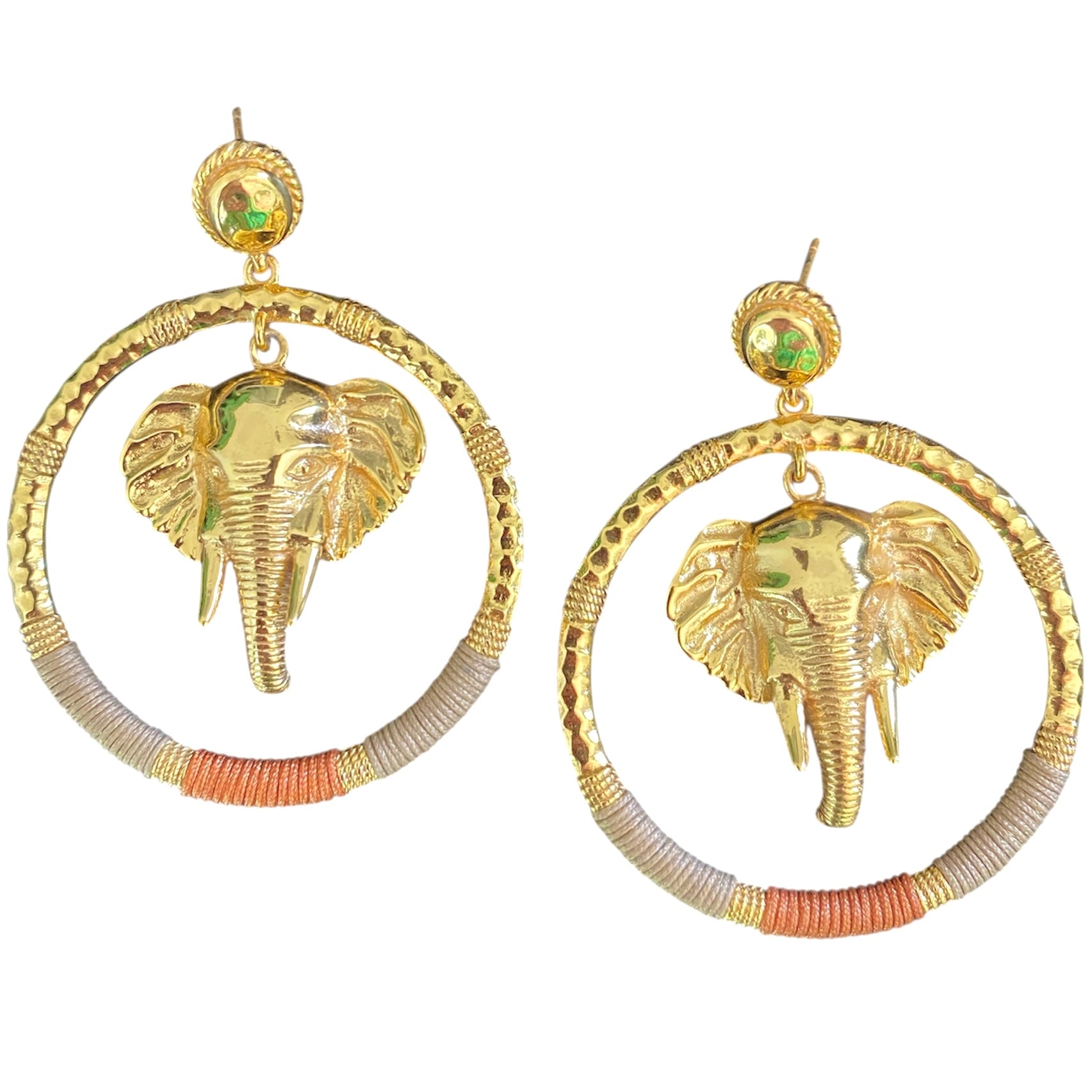 Beim Entwerfen dieser Ohrringe liess sich Pink Sand von der Schönheit Afrikas inspirieren. Das handgefertigte Paar wurde mit braunfarbenen Seidenfäden überzogen und zeigt sich zudem mit markanten Elefantenanhänger. Diese betont grossen Ohrringe verströmen ganz viel Bohème-Flair!
