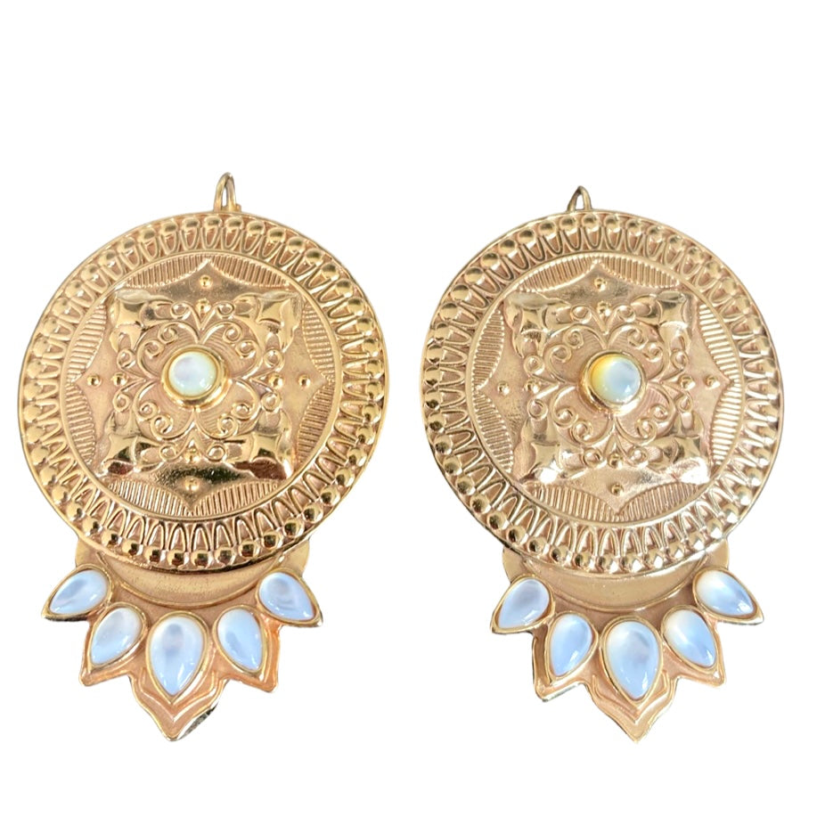 ANANYA bedeutet in Hindi „einzigartig“ – davon zeugen diese kunstvollen Ohrringe. Argento Furioso glaubt an die ganzheitliche Wirkung bestimmter Steine und legt daher viel Wert darauf, ihre natürliche Schönheit zu erhalten und optimal zur Geltung zu bringen. Das Paar wurde aus Messing gefertigt und an den Enden sowie in der Mitte mit Perlmuttsteinen verziert.