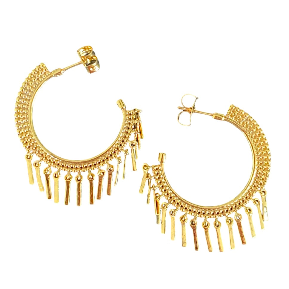 Diese klassischen Creolen von Argento Furioso verströmen viel Bohemian-Flair. Das handgefertigte Paar wurde mit einer Reihe von Fransen ähnlichen Anhänger geschmückt. Die Ohrringe haben die perfekte Grösse für den Alltag, eignen sich aber genauso gut für Abendveranstaltungen.