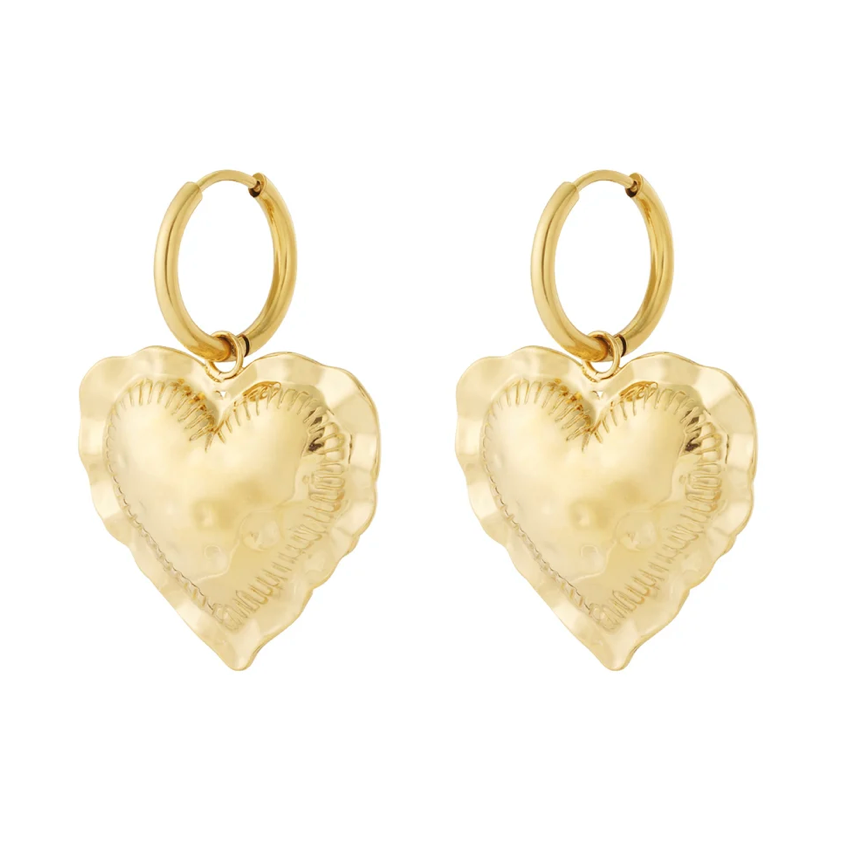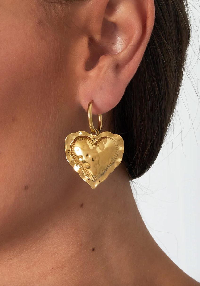 Diese Ohrringe wurden aus Messing gefertigt und zeigen sich in einer Creolen-Form mit jeweils einem herzförmigen Anhänger. Das Paar lässt sich aufgrund seiner moderaten Grösse wunderbar im Alltag einsetzen.