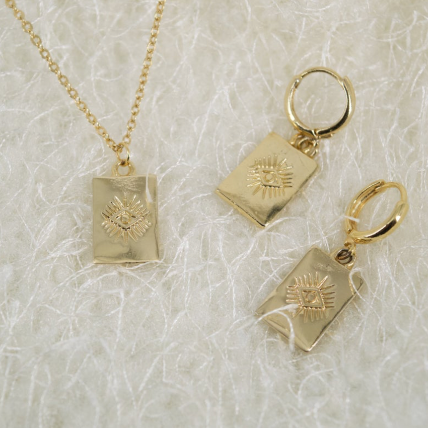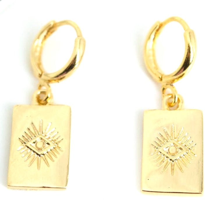 Diese vergoldeten Ohrringe wurden aus Messing gefertigt und mit einem viereckigen Anhänger versehen. Das Schutzauge, ein jahrtausendalter Talisman, soll vor negativen Energien beschützen. Die Ohrringe eignen sich sowohl für tagsüber als auch für abends. Tragen Sie sie zusammen mit der passenden Halskette.