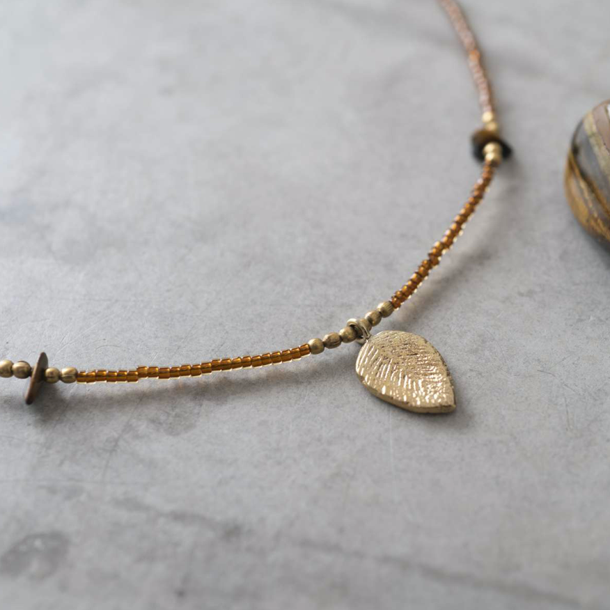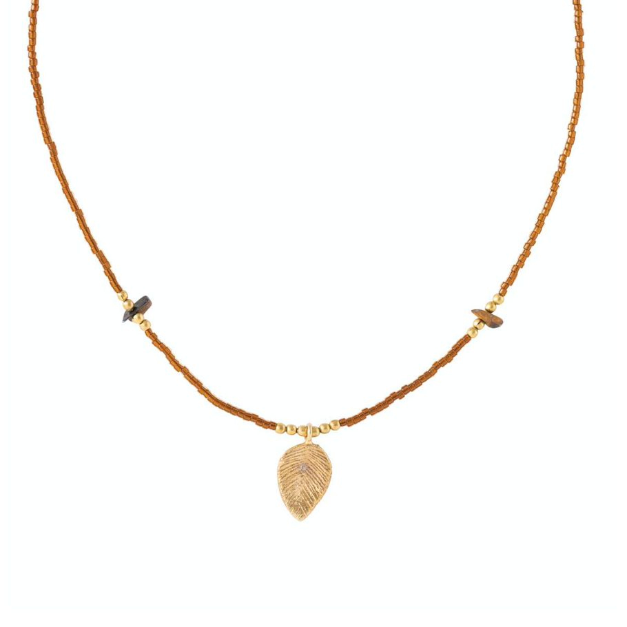 Diese Halskette besteht aus facettierten Messingperlen, einem kleinen vergoldeten Blattanhänger und zwei kleinen Tigerauge-Edelsteinen. Das Tigerauge besitzt eine beruhigende Wirkung. Sich Sorgen machen und in Gedanken hängen bleiben: Kommt Ihnen das bekannt vor? Das Tigerauge bestärkt Sie und flüstert Ihnen zu, dass Sie einfach Ihrem Gefühl folgen dürfen. Tragen Sie die Kette alleine oder zusammen mit längeren Modellen.