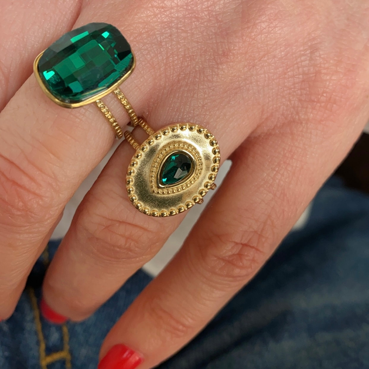 Dieser Ring besteht aus vergoldetem Messing und ist mit einem tropfenförmigen grünen Glasstein besetzt. Dank der Öffnung kann der Ring beliebig am Finger angepasst werden. Tragen Sie ihn mit ähnlich auffälligen oder schlichten Varianten.