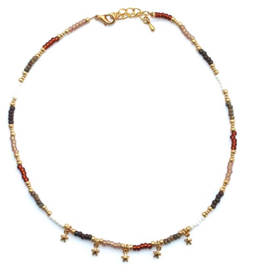 Die Ketten von Melz Amsterdam sind dafür gedacht, miteinander kombiniert zu werden. Diese kurze Kette etwa sieht besonders schick aus, wenn Sie sie mit längeren Modellen getragen wird. Sie wurde aus bunten Miyukiperlen und vergoldeten Kügelchen von Hand gefertigt und mit fünf kleinen vergoldeten Sternchen verziert. Sie harmoniert sowohl mit schlichten T-Shirts als auch mit tiefen Ausschnitten.
