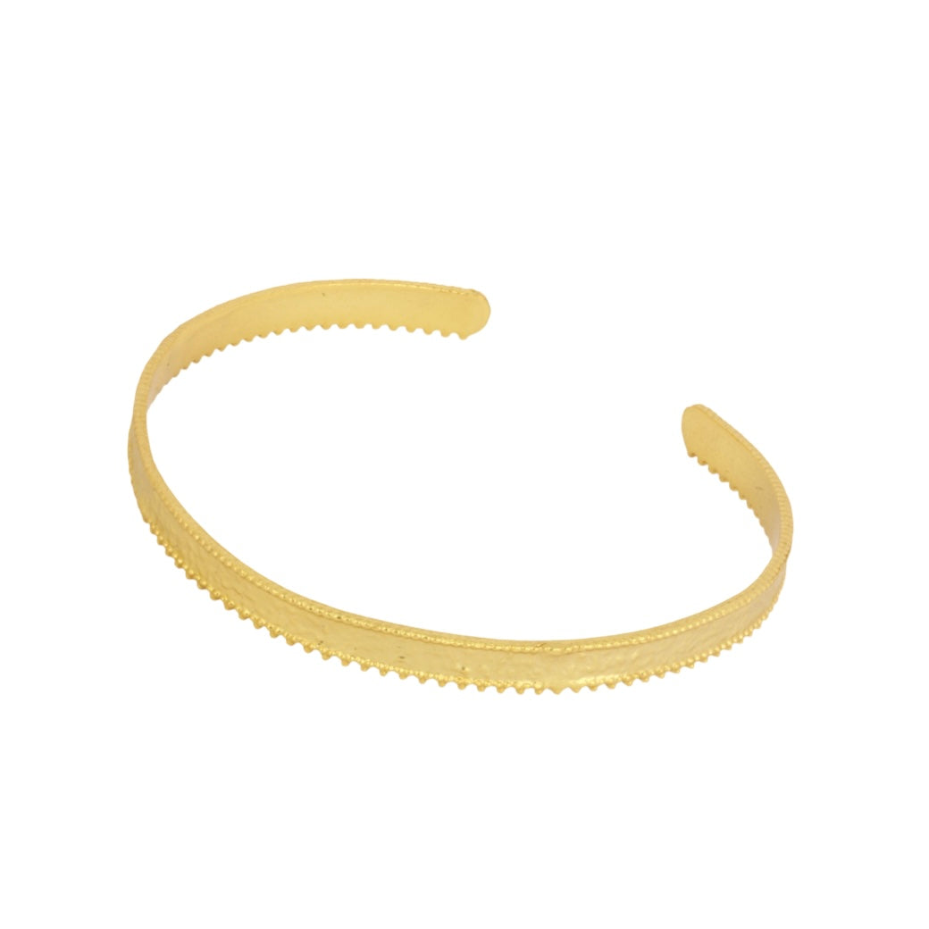 Diese schöne, verstellbare Armspange wurde aus vergoldetem Messing handgefertigt und beeindruckt durch ihre Schlichtheit sowie den Spitzenkanten entlang der Schiene. Die filigranen Details ermöglichen ein nahtloses Stapeln mit anderen Armreifen und bieten so raffinierte Schichtoptionen.