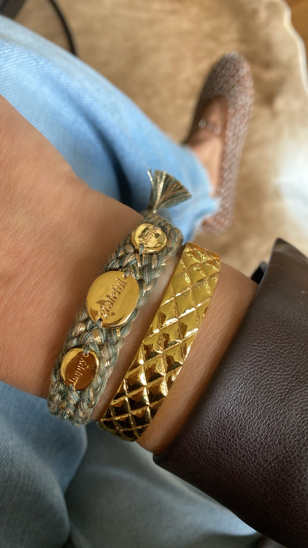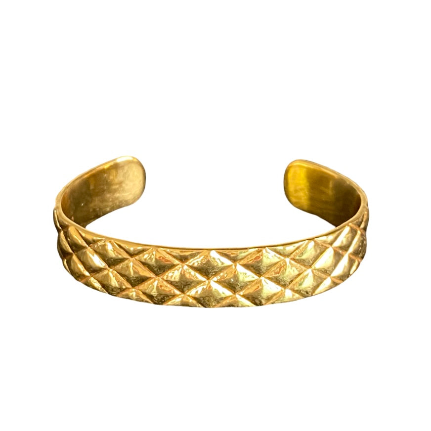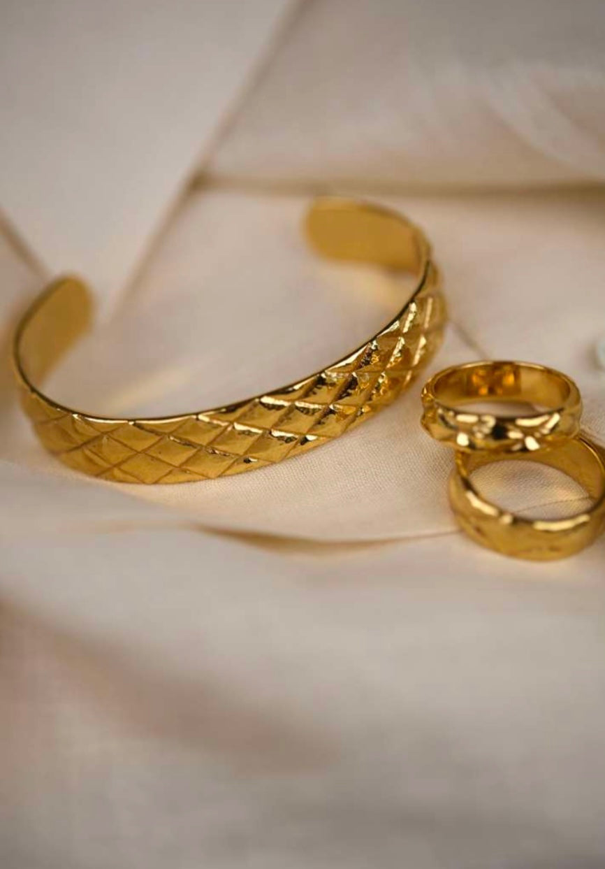Diese Armspange aus der neuen Kollektion von Pink Sand passt perfekt zu minimalistischen Kleidungsstücken. Das breite, markante Schmuckstück aus vergoldetem Messing hat eine glatte Unterseite und ist daher bequem.