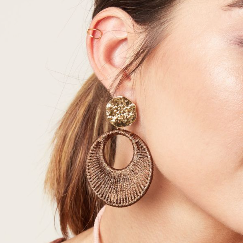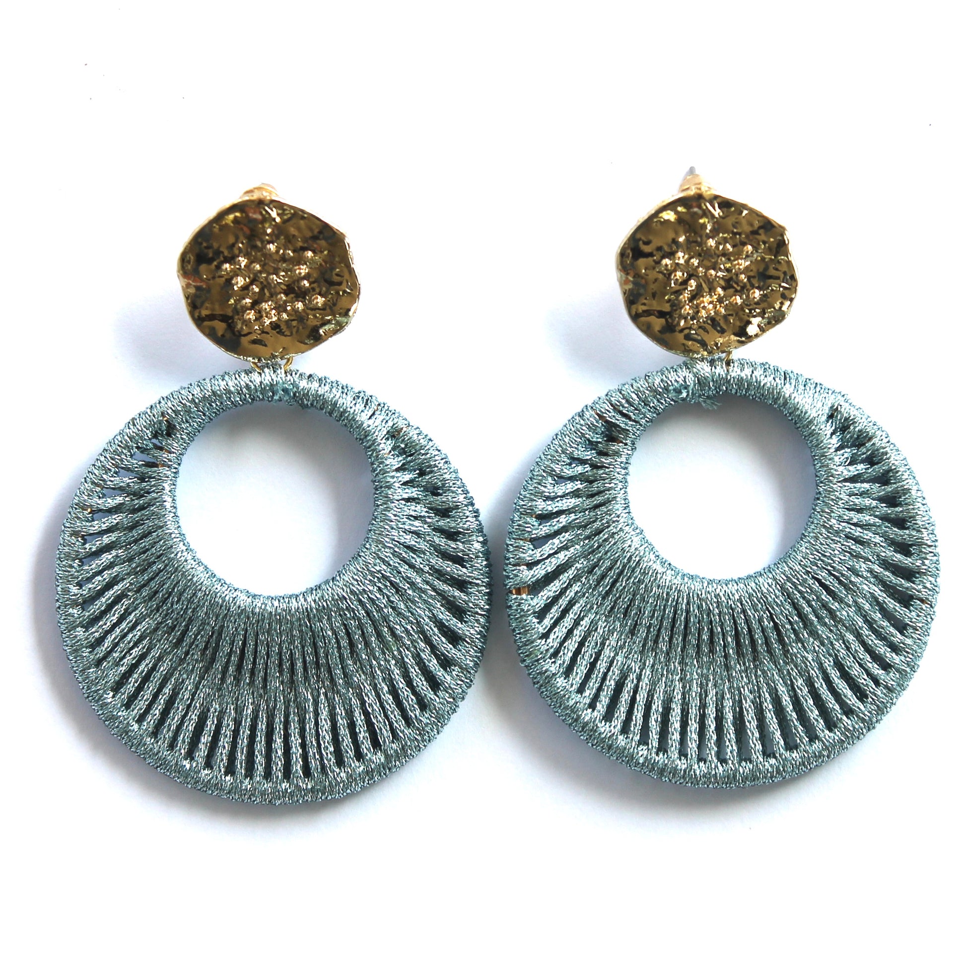 Diese einzigartigen Ohrringe bestehen aus runden gehämmerten Stecker und aus Creolen, welche sorgfältig mit ausgewählten, metallglänzenden Fäden verziert wurden. In Kombination mit farbenfrohen Prints sind die Modelle ein wahrer Blickfang.
