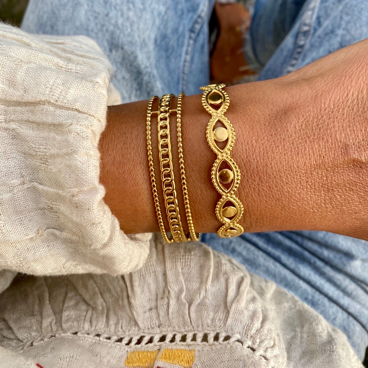 Diese Armspange zeigt sich mit einer Reihe von Evil Eyes – der antike Talisman soll die Trägerin vor negativen Energien beschützen und Glück sowie Reichtum bringen. Kombinieren Sie dieses Schmuckstück aus vergoldetem oder versilbertem Messing wahlweise mit mehreren Armbändern. Der passende Ring ist ebenfalls im Shop erhältlich.