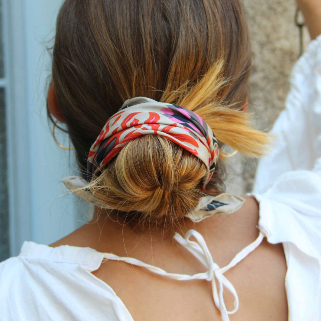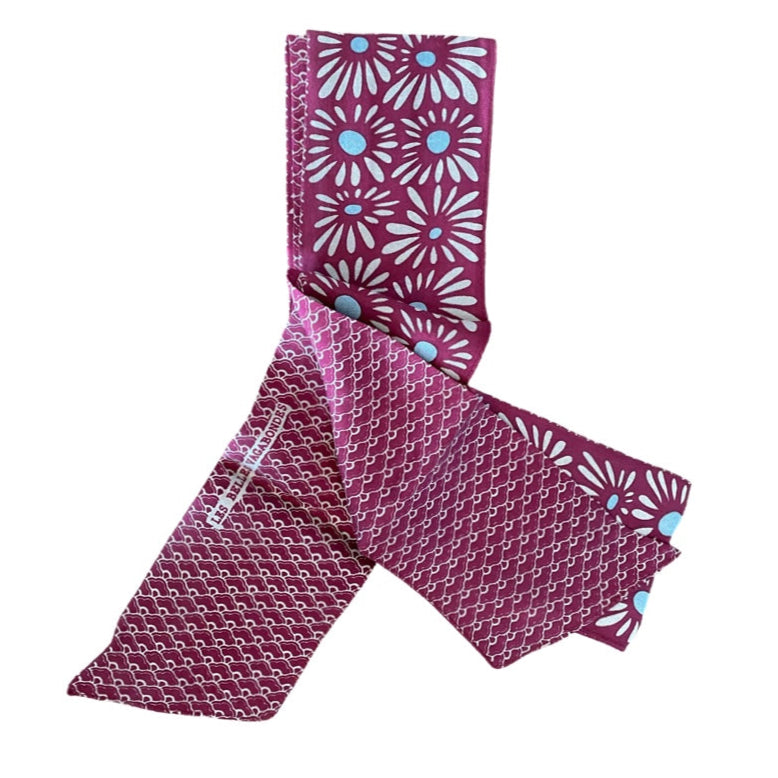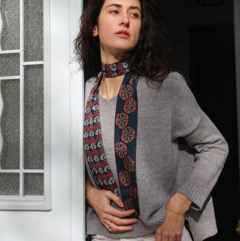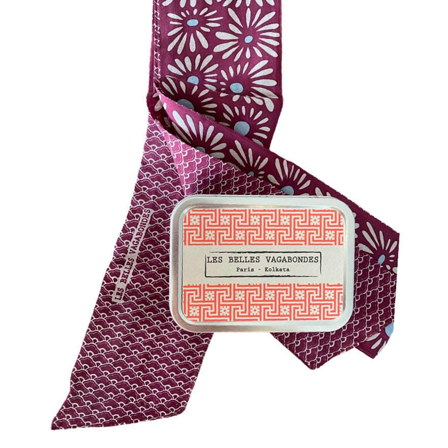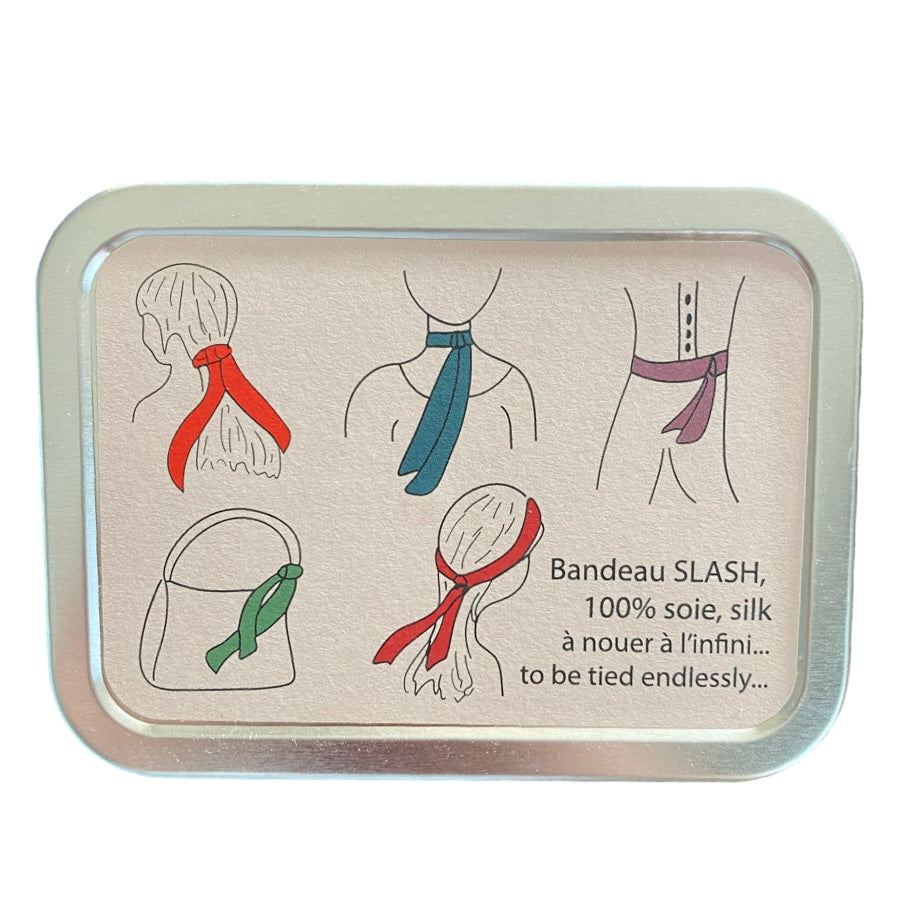 Dieses schmale Doubleface-Seidenband wurde in Indien handgefertigt, wobei sich jede Seite mit einem unterschiedlichen Muster zeigt. Das Tuch kann in einem Dutt, um den Hals, um das Handgelenk, oder als Gurt getragen werden sowie an einem Hut oder an einer Tasche befestigt werden. Das Accessoires wird in einer Eisenbox mit elegantem und wiederverwendbarem Design verkauft und eignet sich dank der originellen Verpackung auch als Geschenk. Ein unverzichtbares, cooles Modeaccessoire, um Ihre Outfits mit einem Hauch von Farbe und Originalität zu vervollständigen.